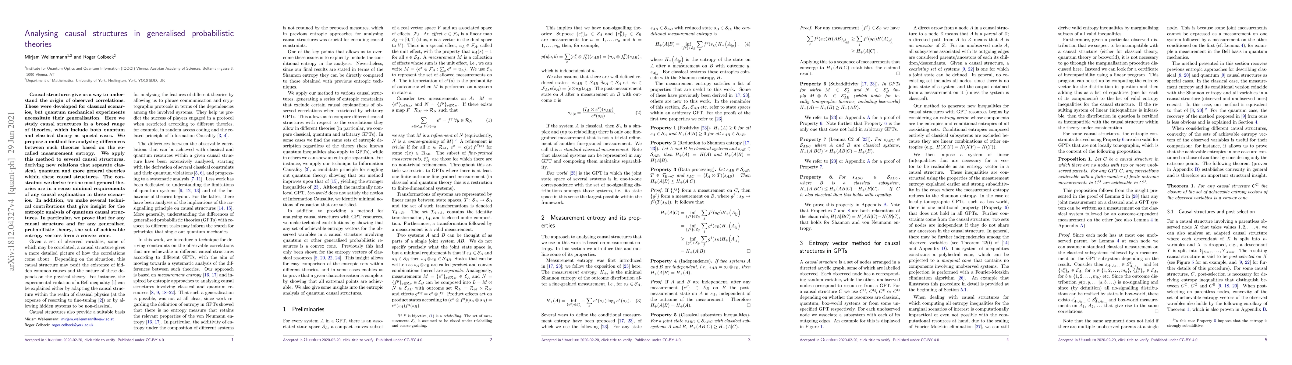 This paper proposes a method for analyzing causal structures in generalised probabilistic theories, including both quantum and classical scenarios, using measurement entropy. It derives new relations that distinguish between these theories and establishes that the set of achievable entropy vectors forms a convex cone, providing minimal constraints for causal explanations.