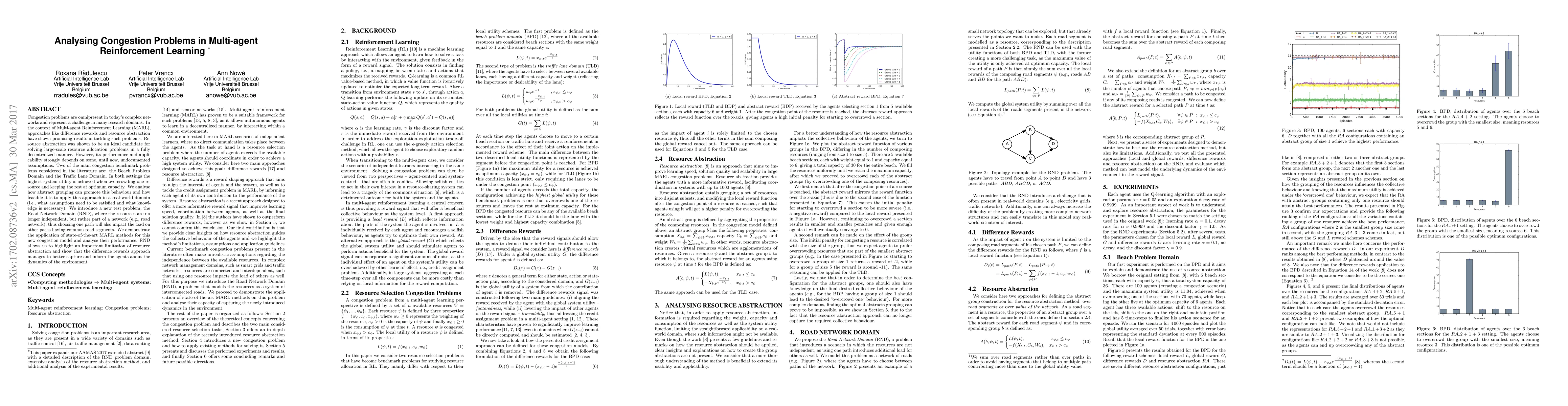 Congestion problems are omnipresent in today's complex networks and represent a challenge in many research domains. In the context of Multi-agent Reinforcement Learning (MARL), approaches like difference rewards and resource abstraction have shown promising results in tackling such problems. Resource abstraction was shown to be an ideal candidate for solving large-scale resource allocation problems in a fully decentralized manner. However, its performance and applicability strongly depends on some, until now, undocumented assumptions. Two of the main congestion benchmark problems considered in the literature are: the Beach Problem Domain and the Traffic Lane Domain. In both settings the highest system utility is achieved when overcrowding one resource and keeping the rest at optimum capacity. We analyse how abstract grouping can promote this behaviour and how feasible it is to apply this approach in a real-world domain (i.e., what assumptions need to be satisfied and what knowledge is necessary). We introduce a new test problem, the Road Network Domain (RND), where the resources are no longer independent, but rather part of a network (e.g., road network), thus choosing one path will also impact the load on other paths having common road segments. We demonstrate the application of state-of-the-art MARL methods for this new congestion model and analyse their performance. RND allows us to highlight an important limitation of resource abstraction and show that the difference rewards approach manages to better capture and inform the agents about the dynamics of the environment.