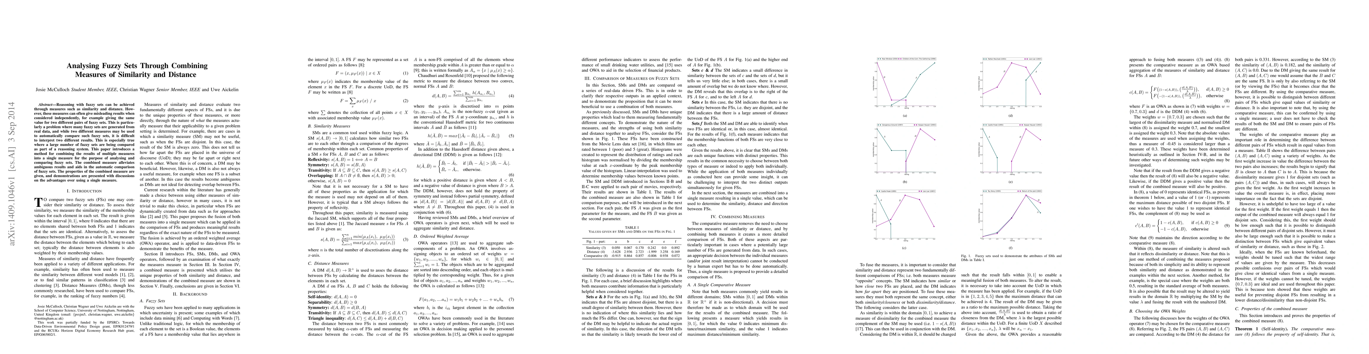 Reasoning with fuzzy sets can be achieved through measures such as similarity and distance. However, these measures can often give misleading results when considered independently, for example giving the same value for two different pairs of fuzzy sets. This is particularly a problem where many fuzzy sets are generated from real data, and while two different measures may be used to automatically compare such fuzzy sets, it is difficult to interpret two different results. This is especially true where a large number of fuzzy sets are being compared as part of a reasoning system. This paper introduces a method for combining the results of multiple measures into a single measure for the purpose of analysing and comparing fuzzy sets. The combined measure alleviates ambiguous results and aids in the automatic comparison of fuzzy sets. The properties of the combined measure are given, and demonstrations are presented with discussions on the advantages over using a single measure.