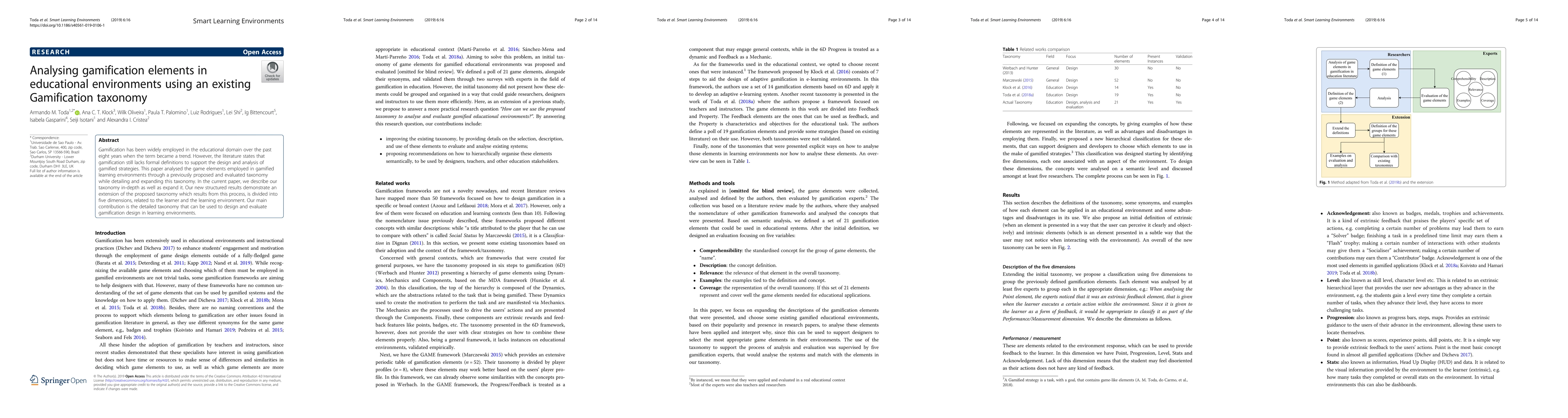 This paper analyzes gamification elements in educational settings using an existing taxonomy, expanding it into five dimensions related to the learner and learning environment. The detailed and extended taxonomy aims to support the design and evaluation of gamified educational strategies.