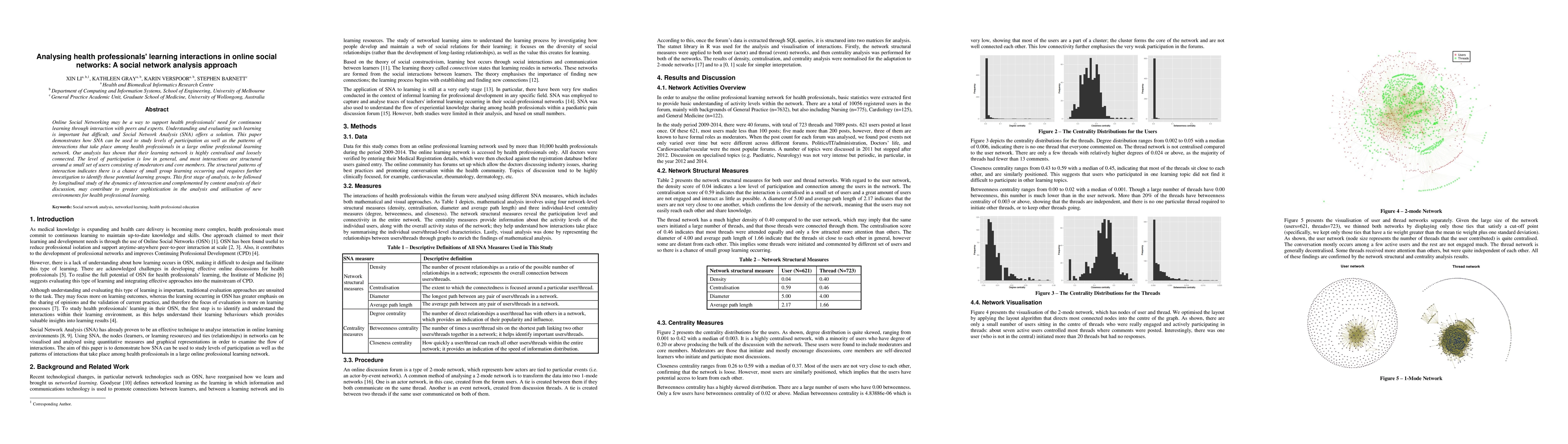 This paper uses Social Network Analysis to study health professionals' learning interactions in an online social network, revealing a highly centralised and loosely connected network with low overall participation, dominated by a few key moderators and core members. Further investigation is needed to explore potential small group learning dynamics.