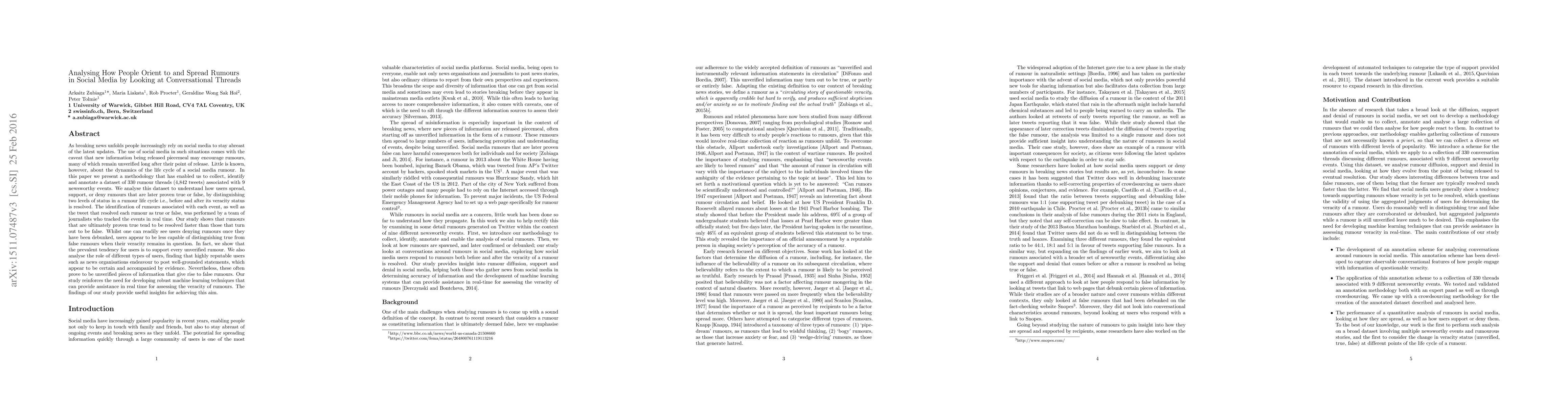 This paper examines how rumours spread on social media through an analysis of 330 rumour threads, identifying that users tend to support unverified rumours and that true rumours are resolved faster than false ones. It highlights the need for better machine learning tools to assess rumour veracity.