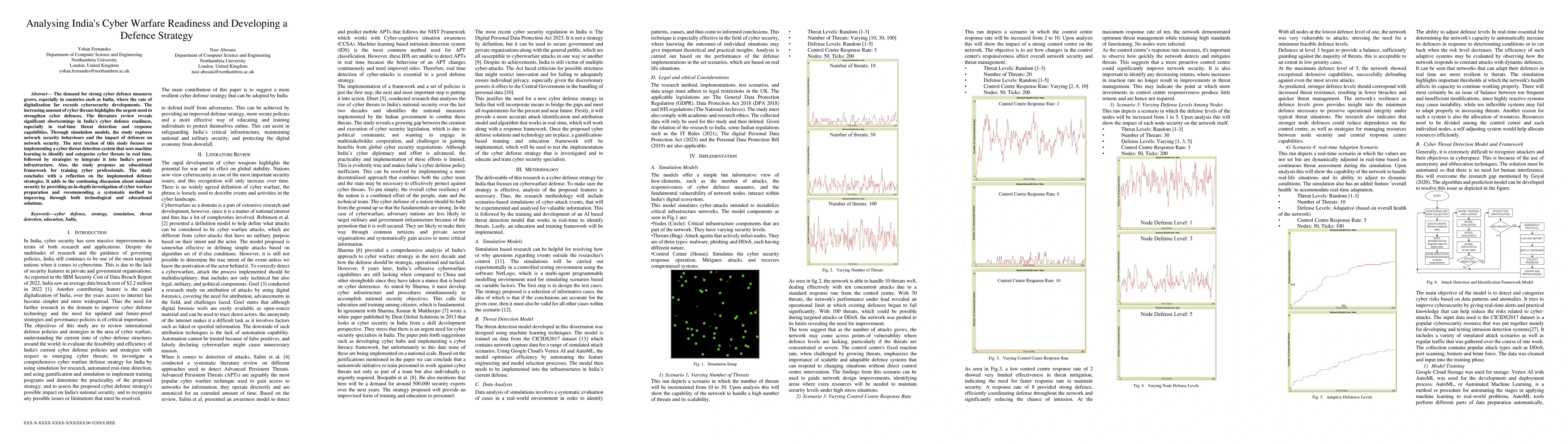 The demand for strong cyber defence measures grows, especially in countries such as India, where the rate of digitalization far exceeds cybersecurity developments. The increasing amount of cyber threats highlights the urgent need to strengthen cyber defences. The literature review reveals significant shortcomings in India's cyber defence readiness, especially in real-time threat detection and response capabilities. Through simulation models, the study explores network security behaviours and the impact of defences on network security. The next section of this study focuses on implementing a cyber threat detection system that uses machine learning to identify and categorise cyber threats in real time, followed by strategies to integrate it into India's present infrastructure. Also, the study proposes an educational framework for training cyber professionals. The study concludes with a reflection on the implemented defence strategies. It adds to the continuing discussion about national security by providing an in-depth investigation of cyber warfare preparation and recommending a systematic method to improving through both technological and educational solutions.