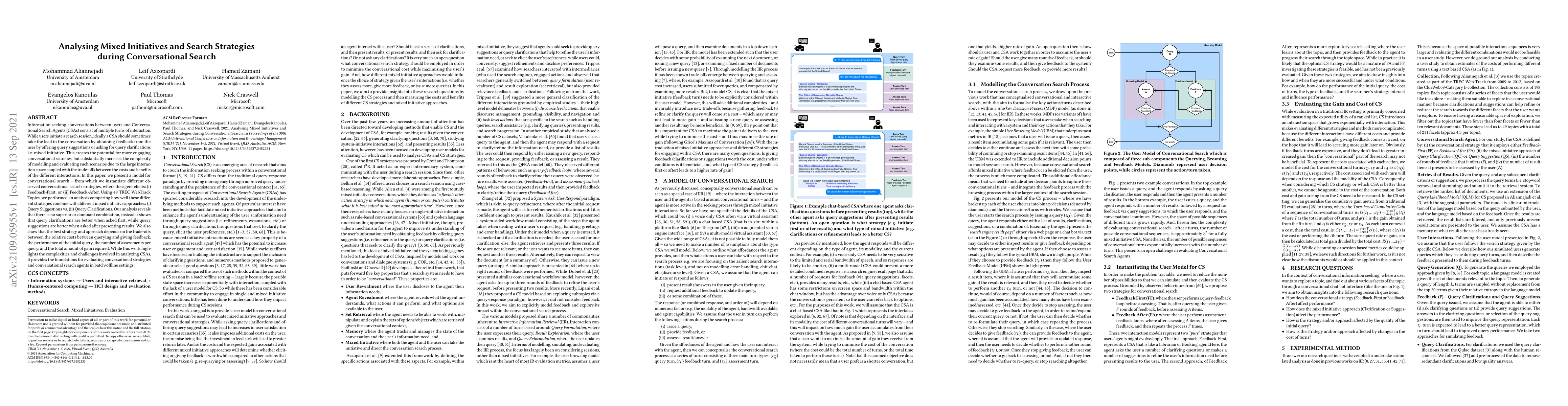 Information seeking conversations between users and Conversational Search Agents (CSAs) consist of multiple turns of interaction. While users initiate a search session, ideally a CSA should sometimes take the lead in the conversation by obtaining feedback from the user by offering query suggestions or asking for query clarifications i.e. mixed initiative. This creates the potential for more engaging conversational searches, but substantially increases the complexity of modelling and evaluating such scenarios due to the large interaction space coupled with the trade-offs between the costs and benefits of the different interactions. In this paper, we present a model for conversational search -- from which we instantiate different observed conversational search strategies, where the agent elicits: (i) Feedback-First, or (ii) Feedback-After. Using 49 TREC WebTrack Topics, we performed an analysis comparing how well these different strategies combine with different mixed initiative approaches: (i) Query Suggestions vs. (ii) Query Clarifications. Our analysis reveals that there is no superior or dominant combination, instead it shows that query clarifications are better when asked first, while query suggestions are better when asked after presenting results. We also show that the best strategy and approach depends on the trade-offs between the relative costs between querying and giving feedback, the performance of the initial query, the number of assessments per query, and the total amount of gain required. While this work highlights the complexities and challenges involved in analyzing CSAs, it provides the foundations for evaluating conversational strategies and conversational search agents in batch/offline settings.
