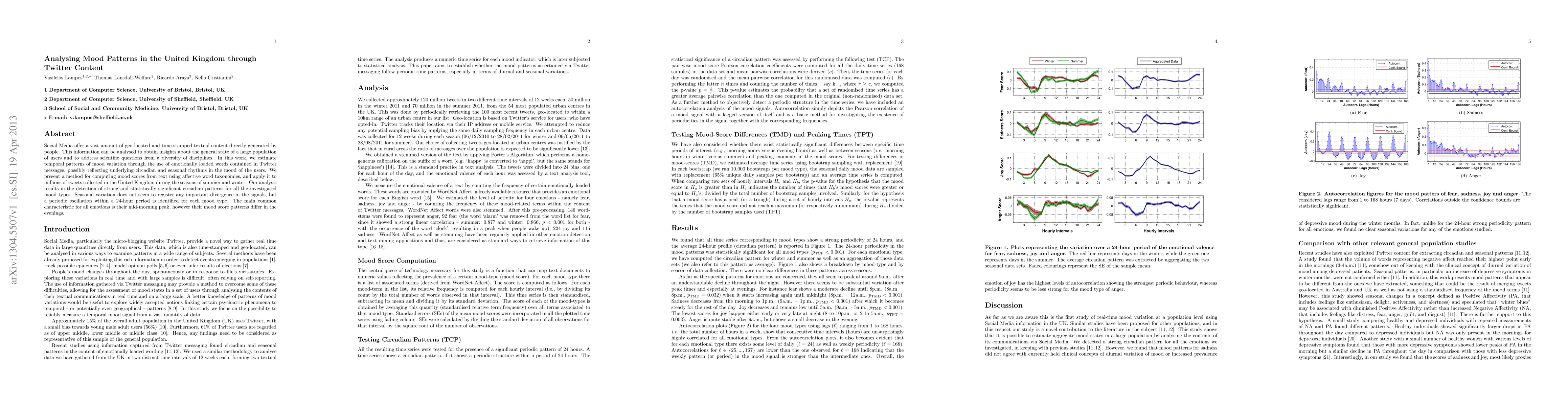 Researchers analyzed Twitter content in the UK to detect mood patterns, finding strong circadian rhythms that peak in mid-morning and show seasonal consistency, with some variation in evening hours.