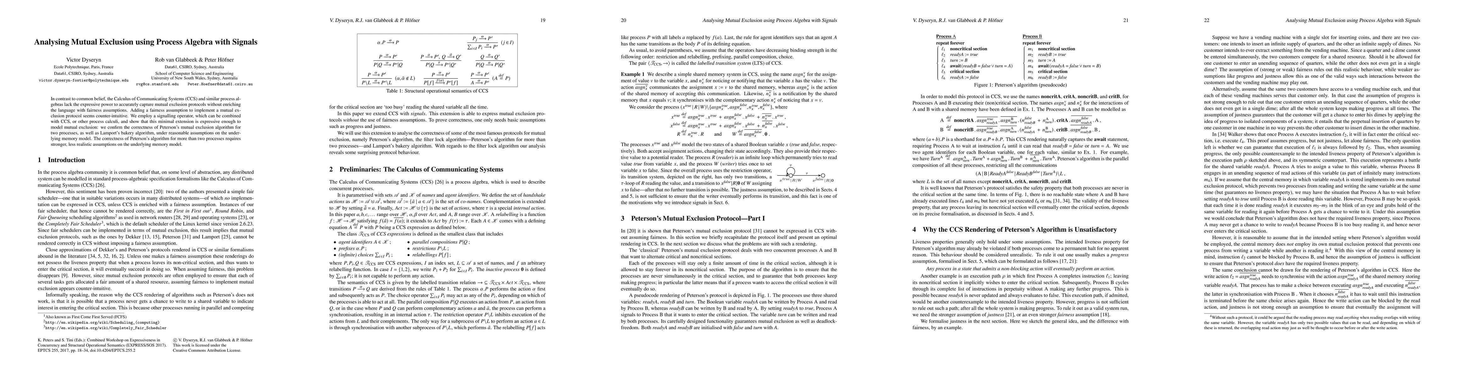 In contrast to common belief, the Calculus of Communicating Systems (CCS) and similar process algebras lack the expressive power to accurately capture mutual exclusion protocols without enriching the language with fairness assumptions. Adding a fairness assumption to implement a mutual exclusion protocol seems counter-intuitive. We employ a signalling operator, which can be combined with CCS, or other process calculi, and show that this minimal extension is expressive enough to model mutual exclusion: we confirm the correctness of Peterson's mutual exclusion algorithm for two processes, as well as Lamport's bakery algorithm, under reasonable assumptions on the underlying memory model. The correctness of Peterson's algorithm for more than two processes requires stronger, less realistic assumptions on the underlying memory model.