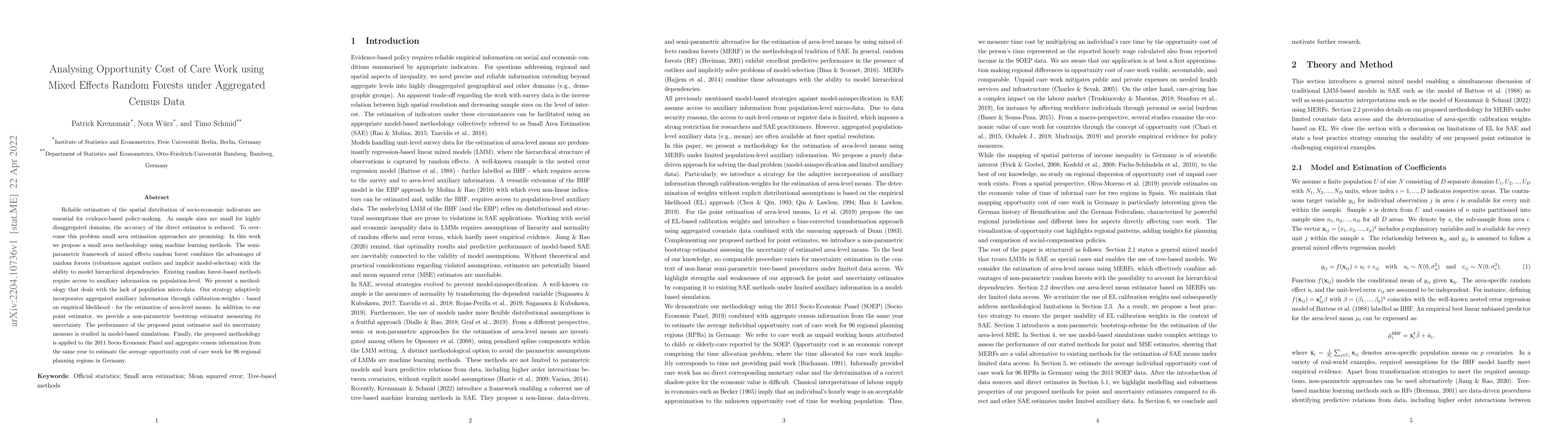 Reliable estimators of the spatial distribution of socio-economic indicators are essential for evidence-based policy-making. As sample sizes are small for highly disaggregated domains, the accuracy of the direct estimates is reduced. To overcome this problem small area estimation approaches are promising. In this work we propose a small area methodology using machine learning methods. The semi-parametric framework of mixed effects random forest combines the advantages of random forests (robustness against outliers and implicit model-selection) with the ability to model hierarchical dependencies. Existing random forest-based methods require access to auxiliary information on population-level. We present a methodology that deals with the lack of population micro-data. Our strategy adaptively incorporates aggregated auxiliary information through calibration-weights - based on empirical likelihood - for the estimation of area-level means. In addition to our point estimator, we provide a non-parametric bootstrap estimator measuring its uncertainty. The performance of the proposed point estimator and its uncertainty measure is studied in model-based simulations. Finally, the proposed methodology is applied to the $2011$ Socio-Economic Panel and aggregate census information from the same year to estimate the average opportunity cost of care work for $96$ regional planning regions in Germany.