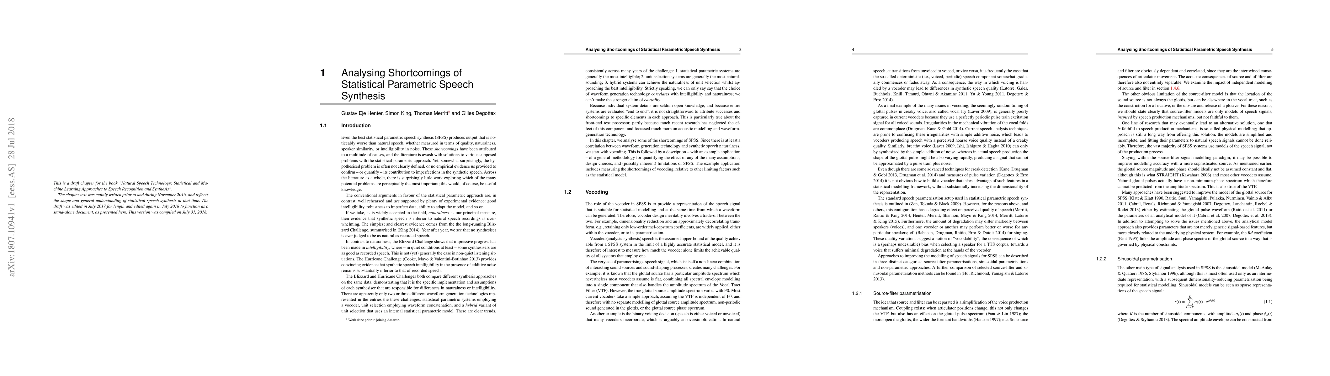This paper analyzes the shortcomings of statistical parametric speech synthesis (SPSS), focusing on quality, naturalness, and intelligibility. It proposes a methodology to quantify the impact of various design choices, specifically highlighting vocoding issues and other contributing factors to perceptual limitations.