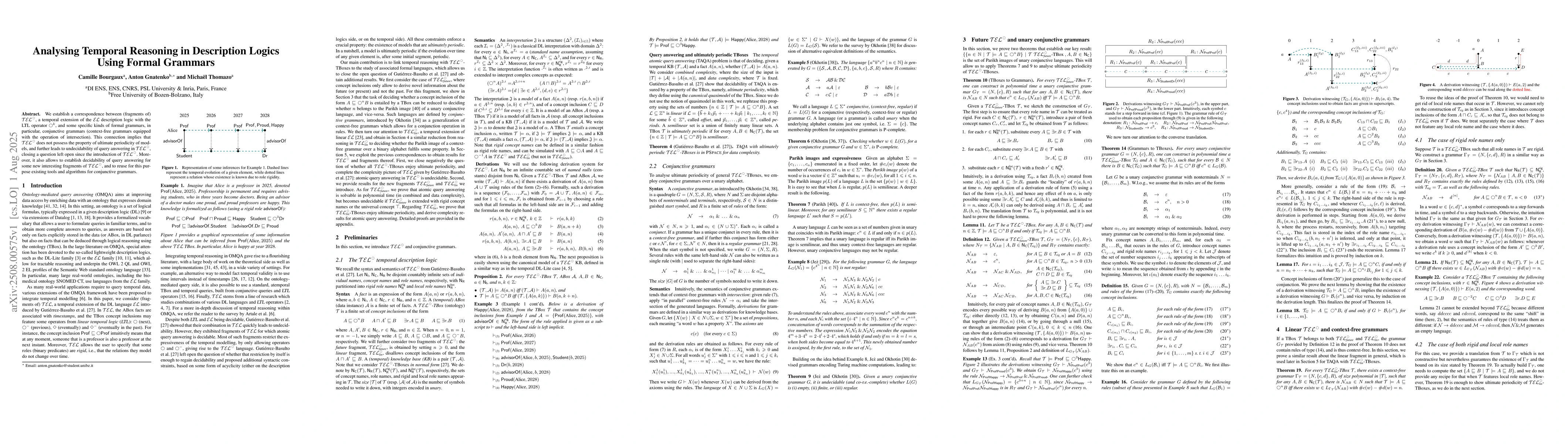 We establish a correspondence between (fragments of) $\mathcal{TEL}^\bigcirc$, a temporal extension of the $\mathcal{EL}$ description logic with the LTL operator $\bigcirc^k$, and some specific kinds of formal grammars, in particular, conjunctive grammars (context-free grammars equipped with the operation of intersection). This connection implies that $\mathcal{TEL}^\bigcirc$ does not possess the property of ultimate periodicity of models, and further leads to undecidability of query answering in $\mathcal{TEL}^\bigcirc$, closing a question left open since the introduction of $\mathcal{TEL}^\bigcirc$. Moreover, it also allows to establish decidability of query answering for some new interesting fragments of $\mathcal{TEL}^\bigcirc$, and to reuse for this purpose existing tools and algorithms for conjunctive grammars.