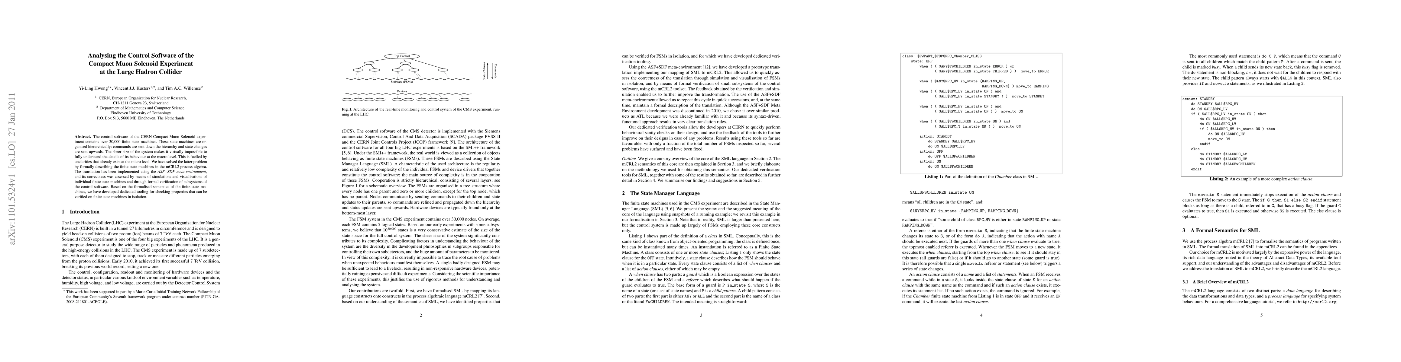The control software of the CERN Compact Muon Solenoid experiment contains over 30,000 finite state machines. These state machines are organised hierarchically: commands are sent down the hierarchy and state changes are sent upwards. The sheer size of the system makes it virtually impossible to fully understand the details of its behaviour at the macro level. This is fuelled by unclarities that already exist at the micro level. We have solved the latter problem by formally describing the finite state machines in the mCRL2 process algebra. The translation has been implemented using the ASF+SDF meta-environment, and its correctness was assessed by means of simulations and visualisations of individual finite state machines and through formal verification of subsystems of the control software. Based on the formalised semantics of the finite state machines, we have developed dedicated tooling for checking properties that can be verified on finite state machines in isolation.