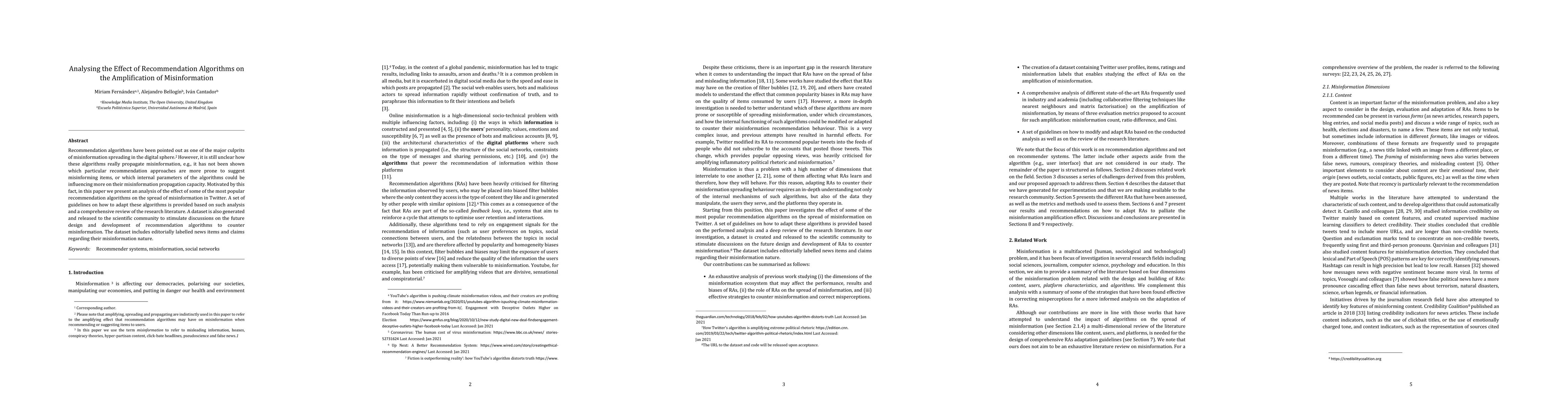 Recommendation algorithms have been pointed out as one of the major culprits of misinformation spreading in the digital sphere. However, it is still unclear how these algorithms really propagate misinformation, e.g., it has not been shown which particular recommendation approaches are more prone to suggest misinforming items, or which internal parameters of the algorithms could be influencing more on their misinformation propagation capacity. Motivated by this fact, in this paper we present an analysis of the effect of some of the most popular recommendation algorithms on the spread of misinformation in Twitter. A set of guidelines on how to adapt these algorithms is provided based on such analysis and a comprehensive review of the research literature. A dataset is also generated and released to the scientific community to stimulate discussions on the future design and development of recommendation algorithms to counter misinformation. The dataset includes editorially labelled news items and claims regarding their misinformation nature.