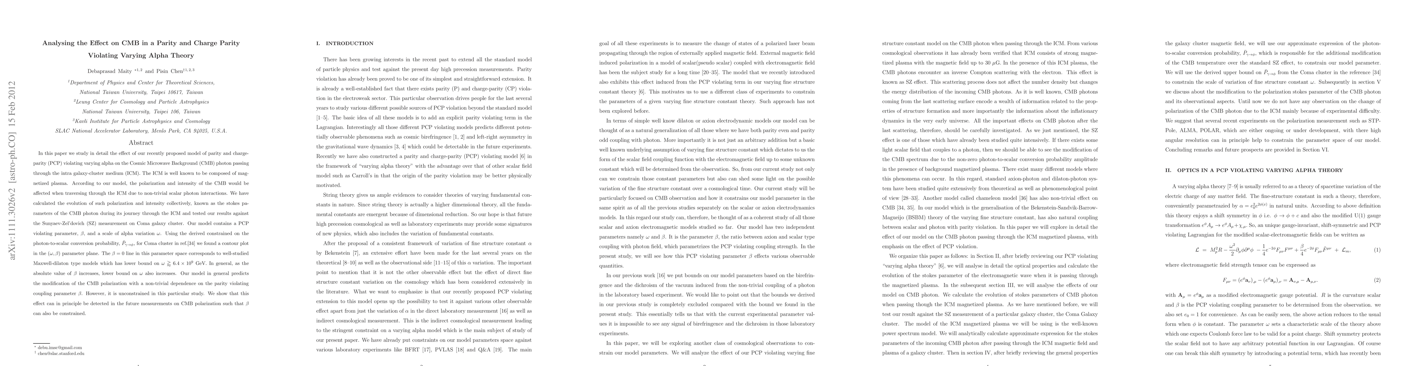 In this paper we study in detail the effect of our recently proposed model of parity and charge-parity (PCP) violating varying alpha on the Cosmic Microwave Background (CMB) photon passing through the intra galaxy-cluster medium (ICM). The ICM is well known to be composed of magnetized plasma. According to our model, the polarization and intensity of the CMB would be affected when traversing through the ICM due to non-trivial scalar photon interactions. We have calculated the evolution of such polarization and intensity collectively, known as the stokes parameters of the CMB photon during its journey through the ICM and tested our results against the Sunyaev-Zel'dovich (SZ) measurement on Coma galaxy cluster. Our model contains a PCP violating parameter, $\beta$, and a scale of alpha variation $\omega$. Using the derived constrained on the photon-to-scalar conversion probability, ${\bar P}_{\gamma \rightarrow \phi}$, for Coma cluster in ref.[34] we found a contour plot in the ($\omega,\beta$) parameter plane. The $\beta =0$ line in this parameter space corresponds to well-studied Maxwell-dilaton type models which has lower bound on $\omega \gtrapprox 6.4 \times 10^{9}$ GeV. In general, as the absolute value of $\beta$ increases, lower bound on $\omega$ also increases. Our model in general predicts the modification of the CMB polarization with a non-trivial dependence on the parity violating coupling parameter $\beta$. However, it is unconstrained in this particular study. We show that this effect can in principle be detected in the future measurements on CMB polarization such that $\beta$ can also be constrained.