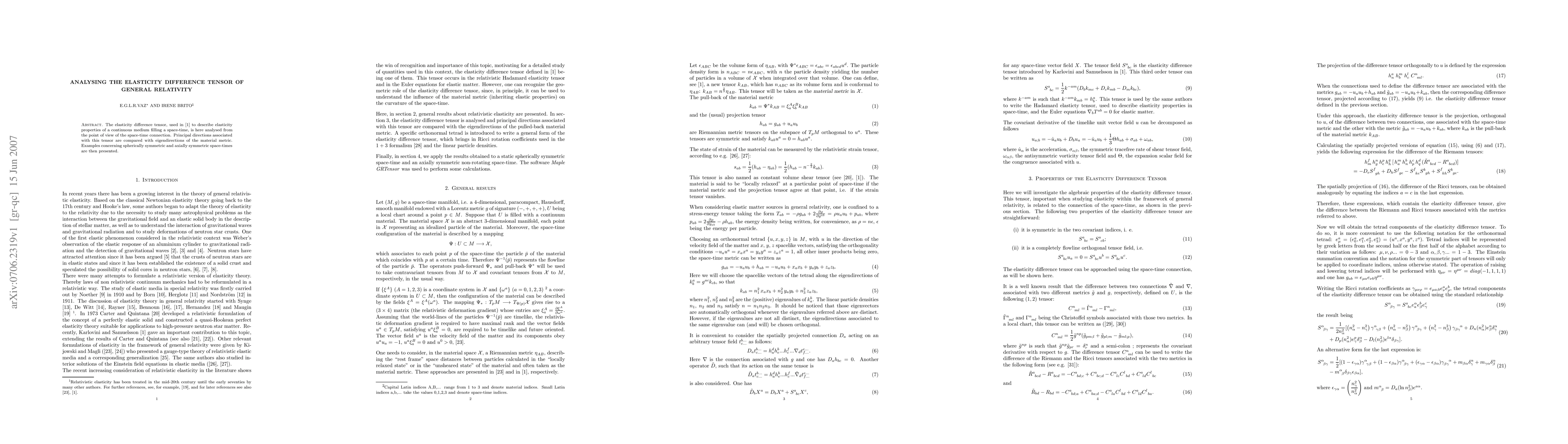 The elasticity difference tensor, used in [1] to describe elasticity properties of a continuous medium filling a space-time, is here analysed from the point of view of the space-time connection. Principal directions associated with this tensor are compared with eigendirections of the material metric. Examples concerning spherically symmetric and axially symmetric space-times are then presented.