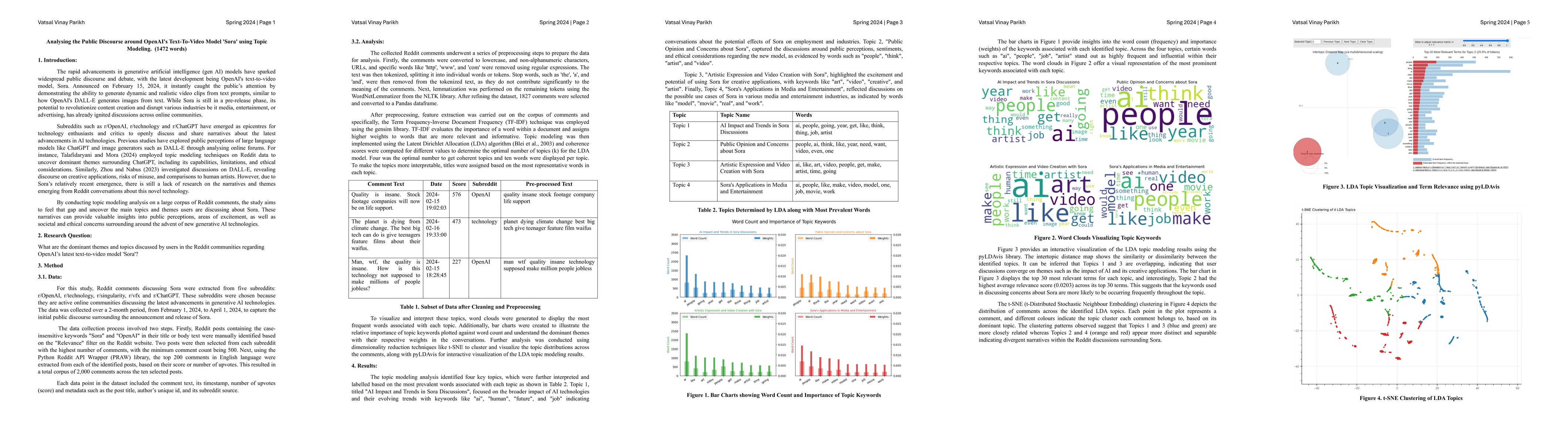The recent introduction of OpenAI's text-to-video model Sora has sparked widespread public discourse across online communities. This study aims to uncover the dominant themes and narratives surrounding Sora by conducting topic modeling analysis on a corpus of 1,827 Reddit comments from five relevant subreddits (r/OpenAI, r/technology, r/singularity, r/vfx, and r/ChatGPT). The comments were collected over a two-month period following Sora's announcement in February 2024. After preprocessing the data, Latent Dirichlet Allocation (LDA) was employed to extract four key topics: 1) AI Impact and Trends in Sora Discussions, 2) Public Opinion and Concerns about Sora, 3) Artistic Expression and Video Creation with Sora, and 4) Sora's Applications in Media and Entertainment. Visualizations including word clouds, bar charts, and t-SNE clustering provided insights into the importance of topic keywords and the distribution of comments across topics. The results highlight prominent narratives around Sora's potential impact on industries and employment, public sentiment and ethical concerns, creative applications, and use cases in the media and entertainment sectors. While limited to Reddit data within a specific timeframe, this study offers a framework for understanding public perceptions of emerging generative AI technologies through online discourse analysis.