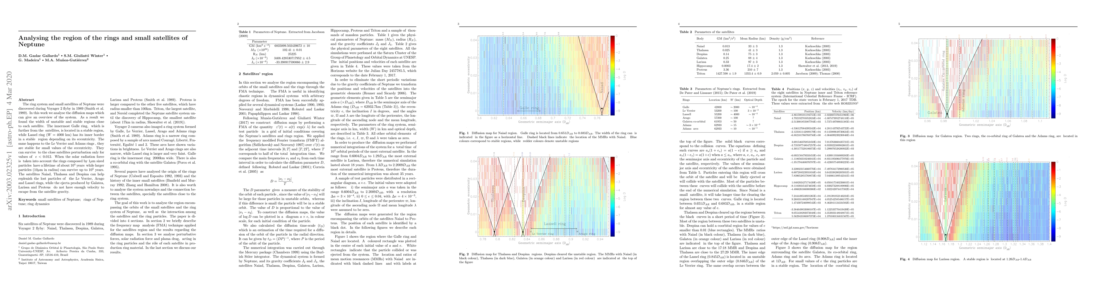 The ring system and small satellites of Neptune were discovered during Voyager 2 flyby in 1989 (Smith et al.1989). In this work we analyse the diffusion maps which can give an overview of the system. As a result we found the width of unstable and stable regions close to each satellite. The innermost Galle ring, which is further from the satellites, is located in a stable region, while Lassel ring (W = 4000 km) has its inner border in a stable region depending on its eccentricity. The same happens to the Le Verrier and Adams rings , they are stable for small values of the eccentricity. They can survive to the close satellites perturbation only for values of e < 0.012. When the solar radiation force is taken into account the rings composed by 1{$\mu$}m sized particles have a lifetime of about $10^4$ years while larger particles (10{$\mu$}m in radius) can survive up to 10 5 years. The satellites Naiad, Thalassa and Despina can help replenish the lost particles of the Le Verrier, Arago and Lassel rings, while the ejecta produced by Galatea, Larissa and Proteus do not have enough velocity to escape from the satellite gravity.