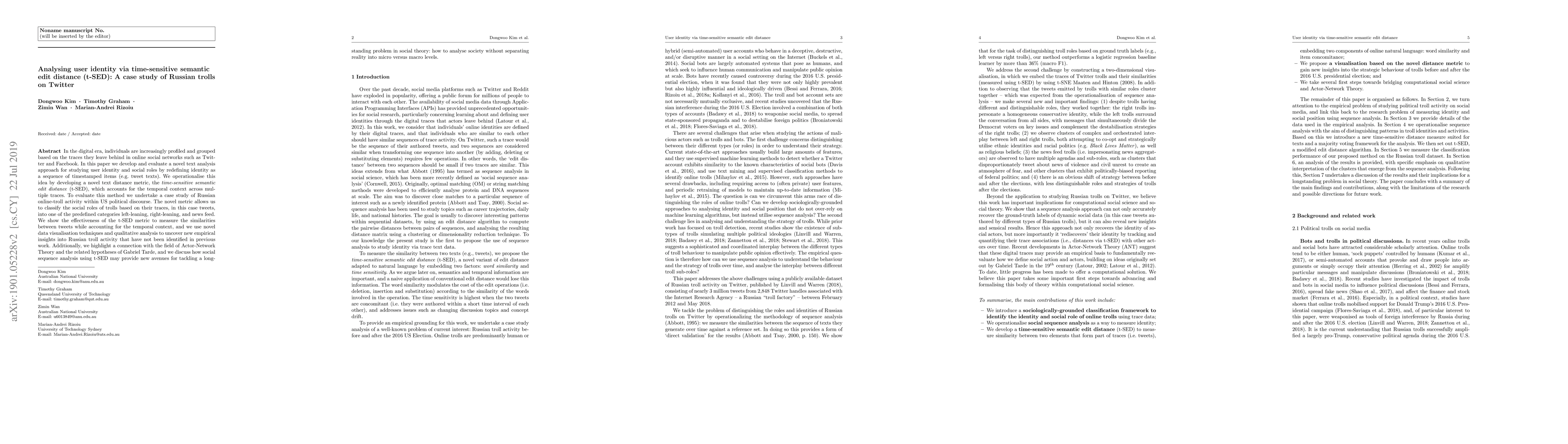 In the digital era, individuals are increasingly profiled and grouped based on the traces they leave behind in online social networks such as Twitter and Facebook. In this paper, we develop and evaluate a novel text analysis approach for studying user identity and social roles by redefining identity as a sequence of timestamped items (e.g. tweet texts). We operationalise this idea by developing a novel text distance metric, the time-sensitive semantic edit distance (t-SED), which accounts for the temporal context across multiple traces. To evaluate this method we undertake a case study of Russian online-troll activity within US political discourse. The novel metric allows us to classify the social roles of trolls based on their traces, in this case tweets, into one of the predefined categories left-leaning, right-leaning, and news feed. We show the effectiveness of the t-SED metric to measure the similarities between tweets while accounting for the temporal context, and we use novel data visualisation techniques and qualitative analysis to uncover new empirical insights into Russian troll activity that have not been identified in previous work. Additionally, we highlight a connection with the field of Actor-Network Theory and the related hypotheses of Gabriel Tarde, and we discuss how social sequence analysis using t-SED may provide new avenues for tackling a longstanding problem in social theory: how to analyse society without separating reality into micro versus macro levels.