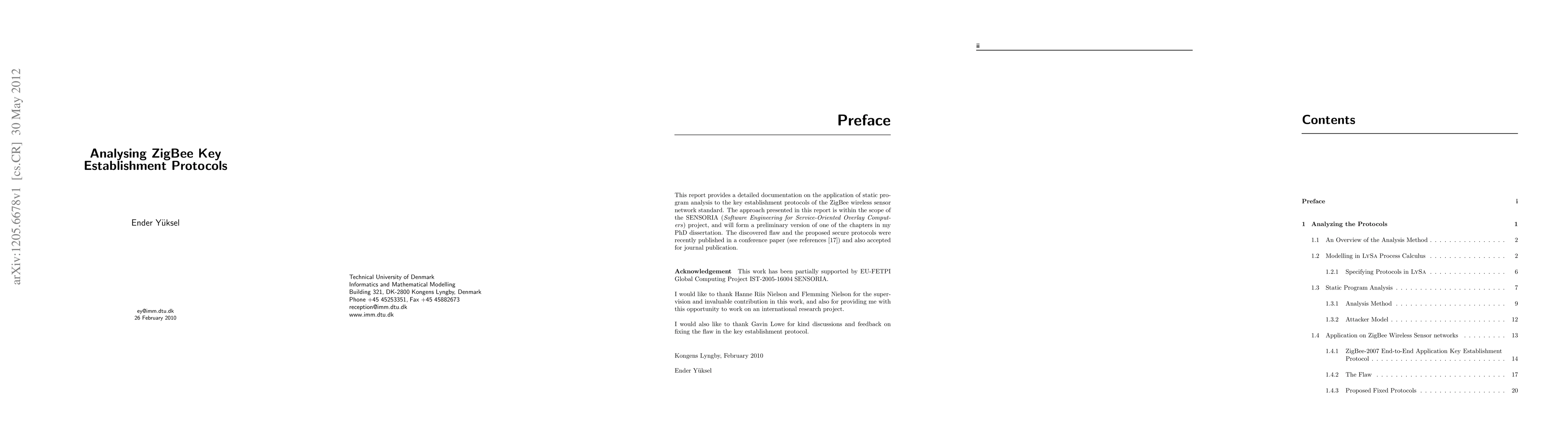 In this report, we present our approach for protocol analysis together with a real example where we find an important flow in a contemporary wireless sensor network security protocol. We start by modelling protocols using a specific process algebraic formalism called LySa process calculus. We then apply an analysis based on a special program analysis technique called control flow analysis. We apply this technique to the ZigBee-2007 End-to-End Application Key Establishment Protocol and with the help of the analysis discover an unknown flaw. Finally we suggest a fix for the protocol, and verify that the fix works by using the same technique.