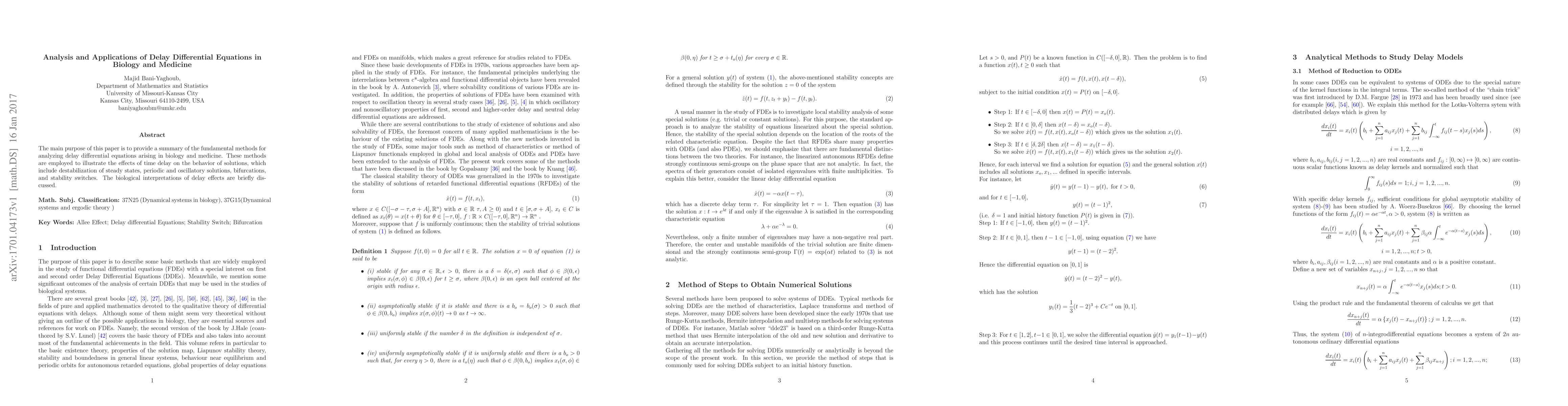This paper offers an overview of techniques to analyze delay differential equations in biological and medical contexts, highlighting how time delay impacts solution behaviors such as destabilization, periodic patterns, bifurcations, and stability shifts. It briefly touches on the biological significance of these delay effects.