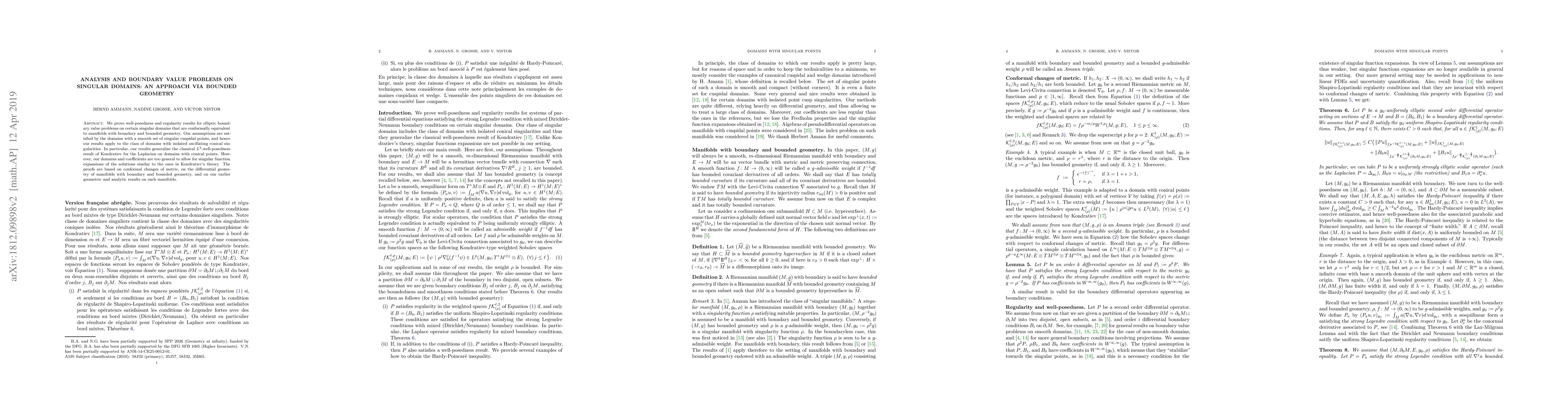 This paper proves well-posedness and regularity for elliptic boundary value problems on domains with smooth singular points, generalizing classical results on conical singularities. The approach utilizes conformal changes of metric, differential geometry, and bounded geometry techniques.