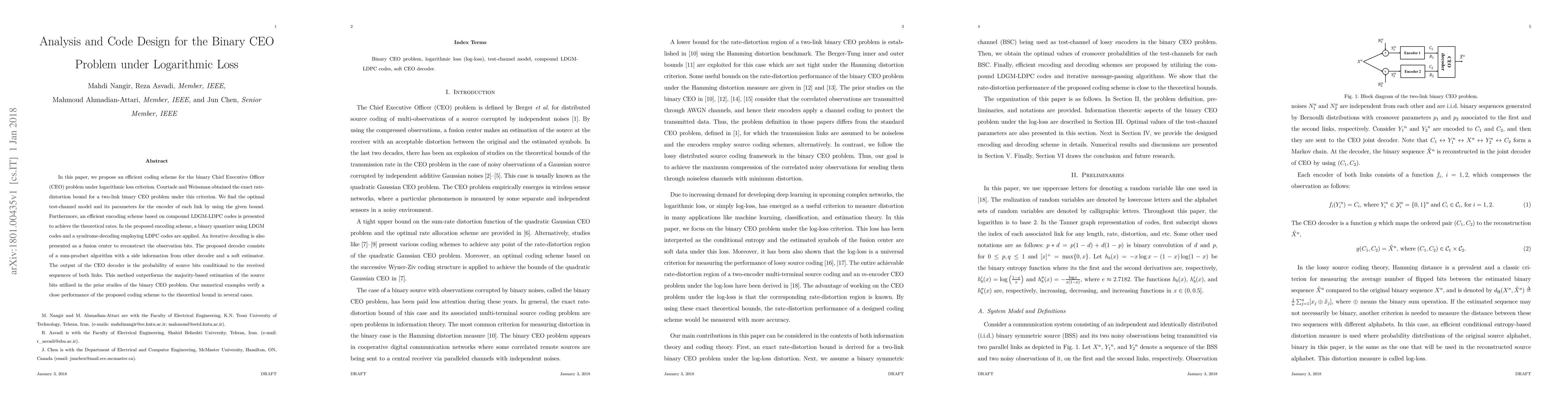 This paper presents an efficient coding scheme for the binary CEO problem under logarithmic loss, achieving better performance than prior studies and verifying its close match to theoretical bounds.
