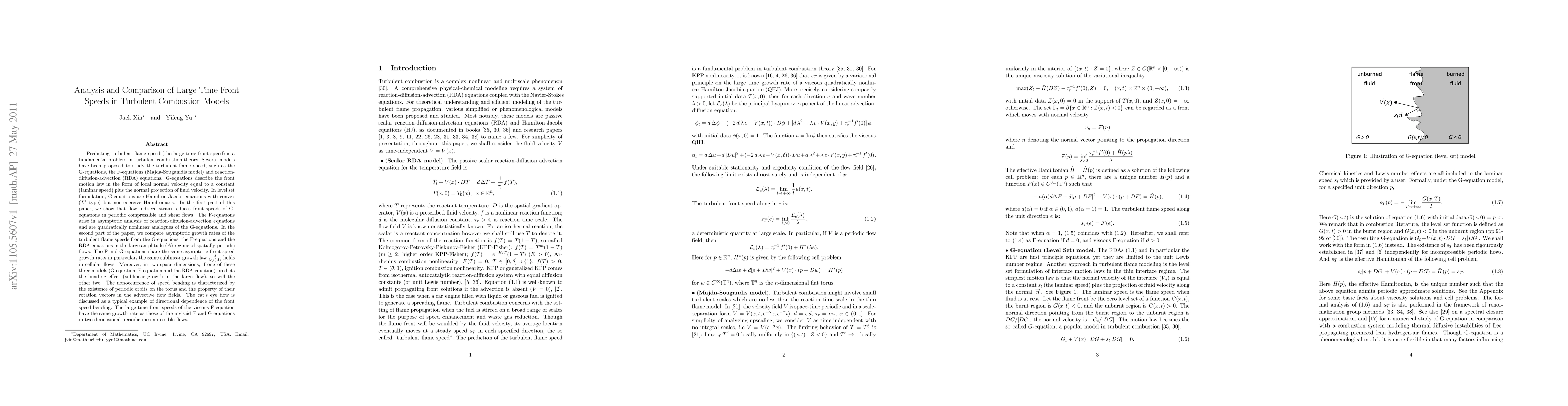 This paper investigates turbulent flame speed models, showing that flow induced strain reduces front speeds in G-equations. It compares the asymptotic growth rates of turbulent flame speeds from G-equations, F-equations, and RDA equations, finding that they share the same sublinear growth law in cellular flows and exhibit bending effects under similar conditions.