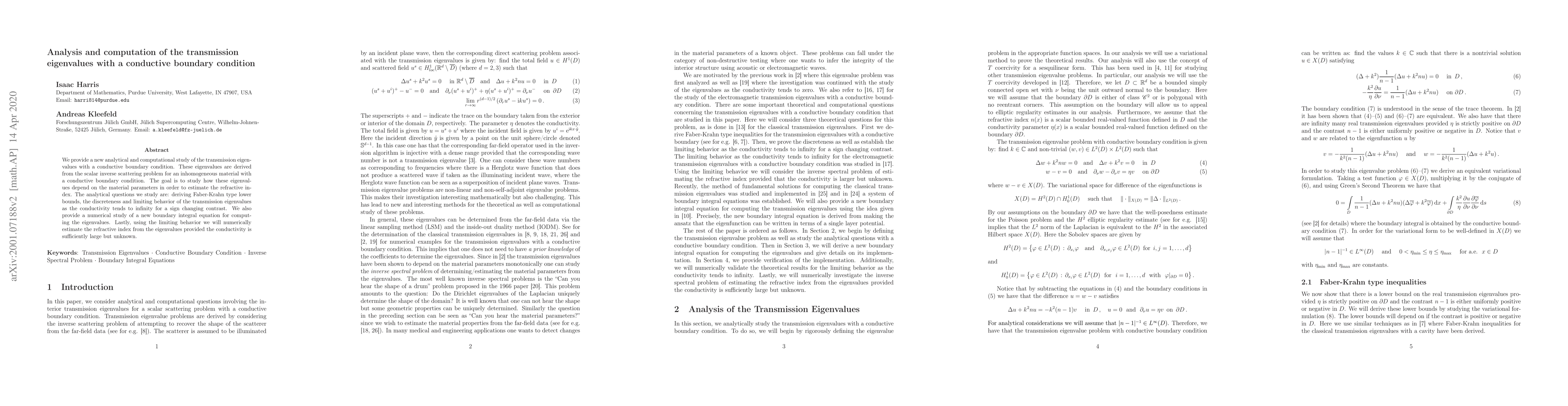 We provide a new analytical and computational study of the transmission eigenvalues with a conductive boundary condition. These eigenvalues are derived from the scalar inverse scattering problem for an inhomogeneous material with a conductive boundary condition. The goal is to study how these eigenvalues depend on the material parameters in order to estimate the refractive index. The analytical questions we study are: deriving Faber-Krahn type lower bounds, the discreteness and limiting behavior of the transmission eigenvalues as the conductivity tends to infinity for a sign changing contrast. We also provide a numerical study of a new boundary integral equation for computing the eigenvalues. Lastly, using the limiting behavior we will numerically estimate the refractive index from the eigenvalues provided the conductivity is sufficiently large but unknown.
