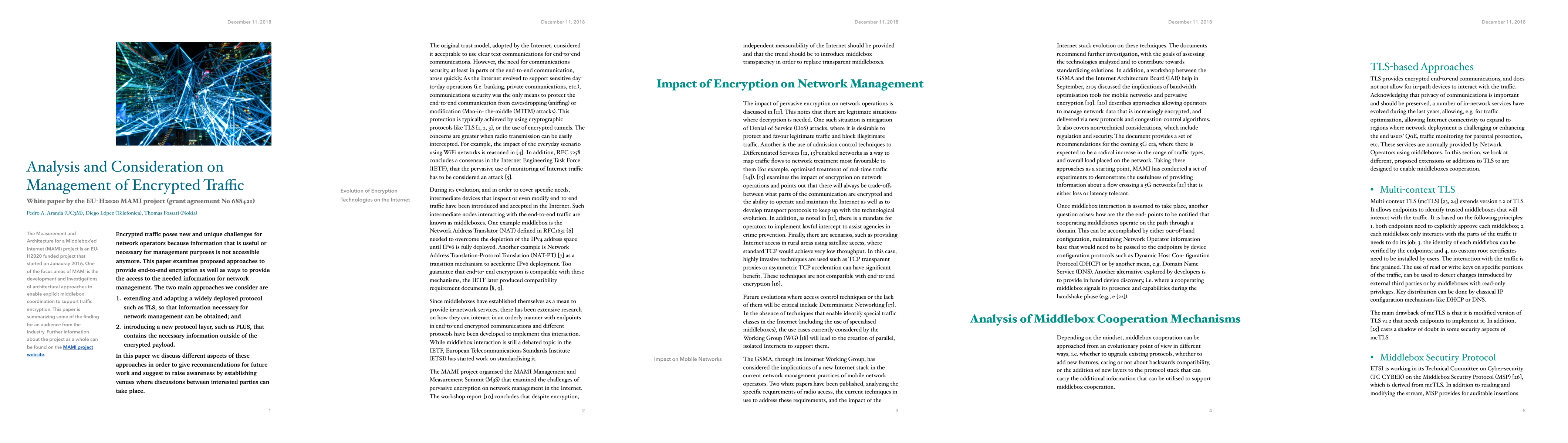 Encrypted traffic poses new and unique challenges for network operators because information that is useful or necessary for management purposes is not accessible anymore. This paper examines proposed approaches to provide end-to-end encryption as well as ways to provide the access to the needed information for network management. The two main approaches we consider are 1.- extending and adapting a widely deployed protocol such as TLS, so that information necessary for network management can be obtained; and 2.- introducing a new protocol layer, such as PLUS, that contains the necessary information outside of the encrypted payload. In this paper we discuss different aspects of these approaches in order to give recommendations for future work and suggest to raise awareness by establishing venues where discussions between interested parties can take place.