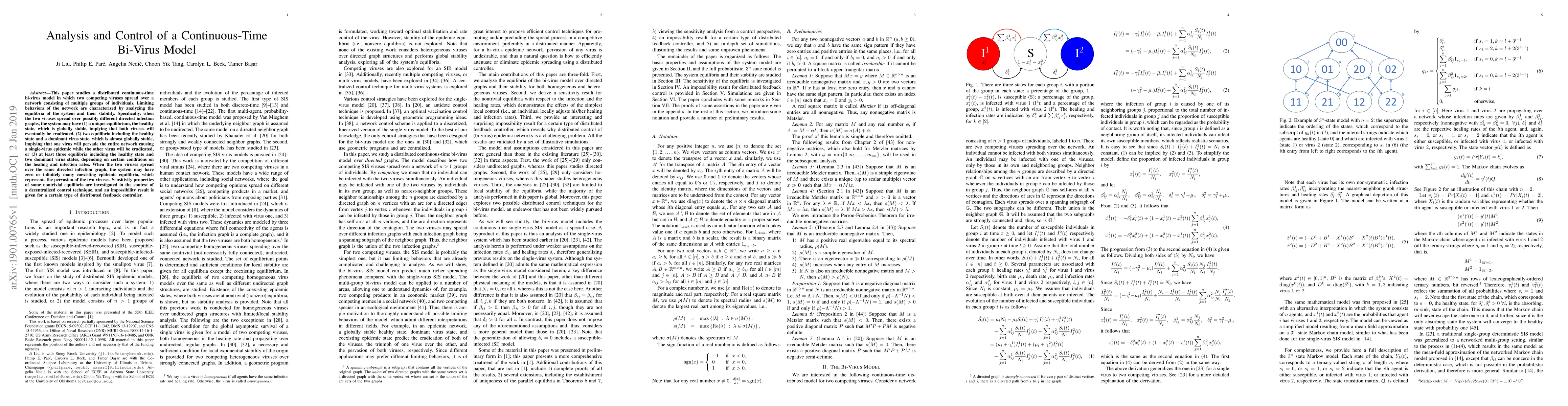 This paper analyzes a continuous-time bi-virus model on a network, identifying the limiting behaviors and stability of equilibria. It finds that the system can lead to eradication of both viruses, a single-virus epidemic, or coexistence of both viruses, depending on infection and healing rates.