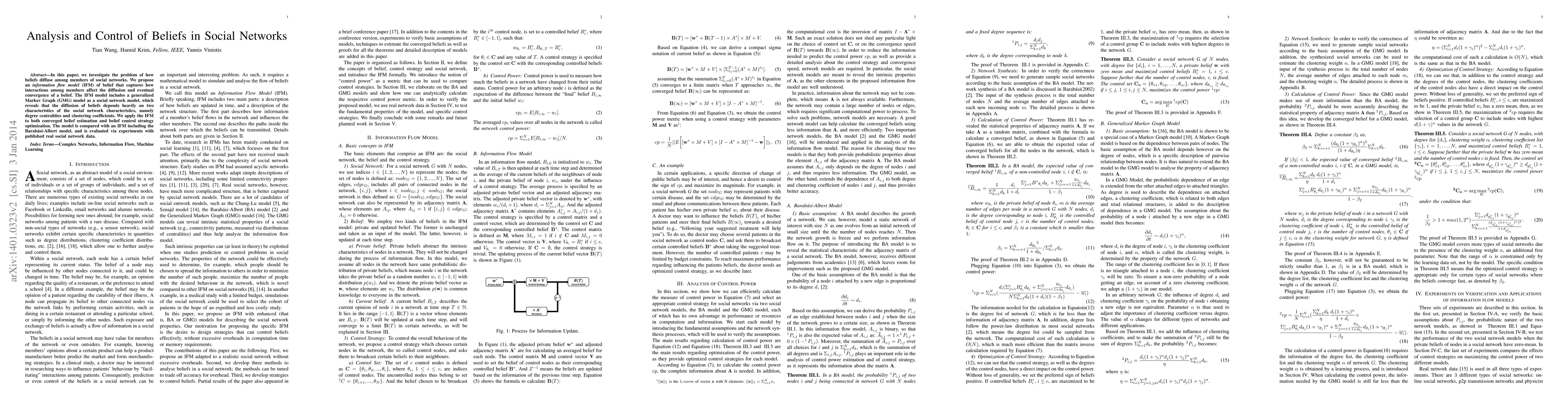 This paper proposes an Information Flow Model (IFM) to analyze belief diffusion in social networks, emphasizing the role of network degree centralities and clustering coefficients. It optimizes belief control strategies and evaluates the model using real social network data.