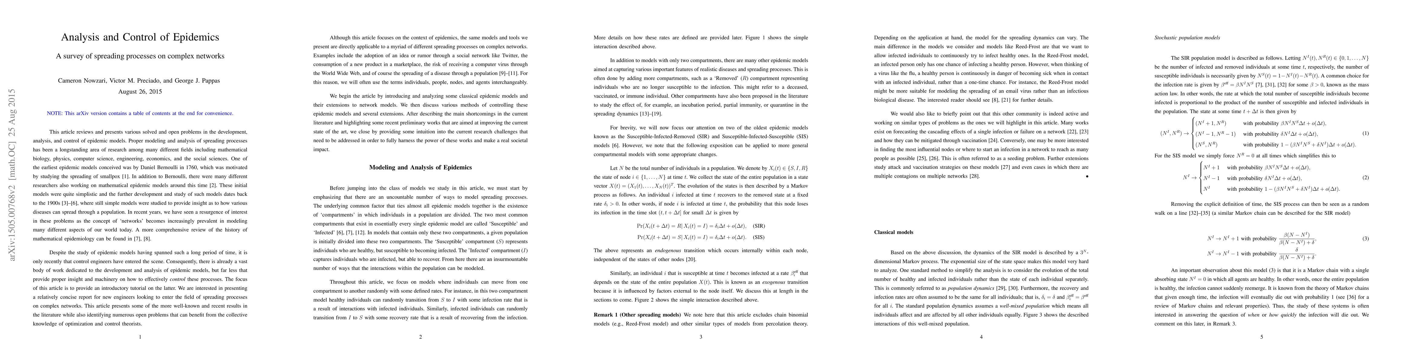This article reviews and presents various solved and open problems in the development, analysis, and control of epidemic models. We are interested in presenting a relatively concise report for new engineers looking to enter the field of spreading processes on complex networks.