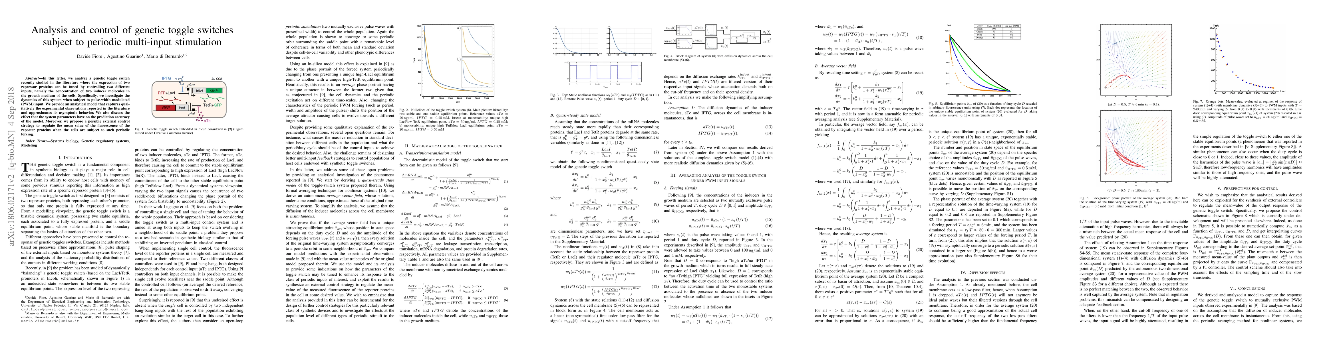 This paper analyzes a genetic toggle switch controlled by two inducer molecules, examining its dynamics under pulse-width modulated inputs. The authors develop an analytical model that aligns with experimental observations and discuss the impact of system parameters on model accuracy, proposing a control strategy to regulate reporter protein fluorescence under periodic stimulation.