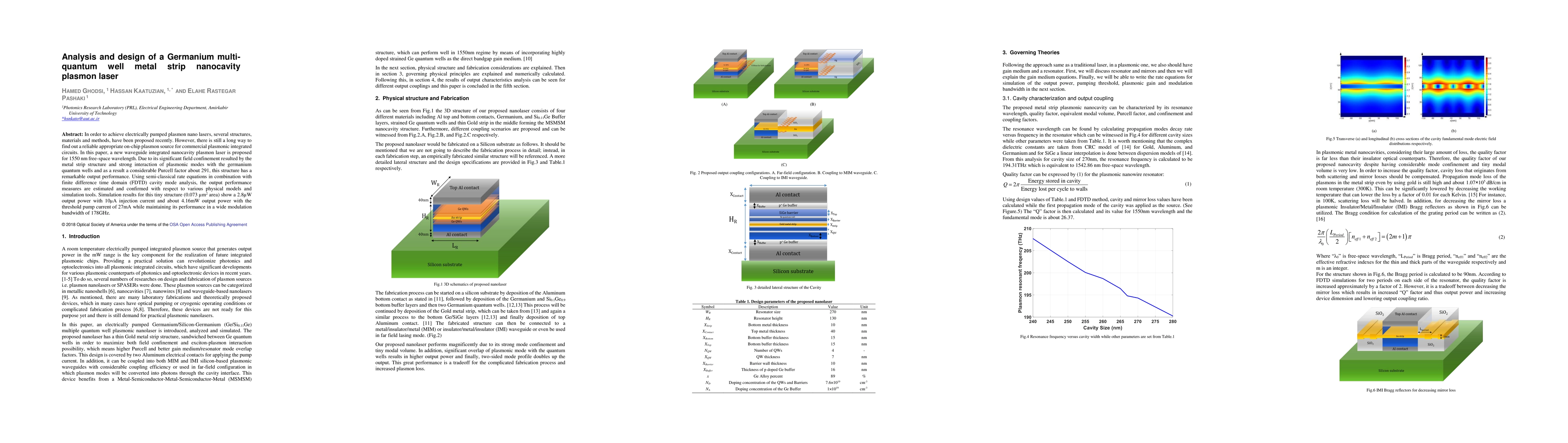 In order to achieve electrically pumped plasmon nano lasers, several structures, materials and methods, have been proposed recently. However, there is still a long way to find out a reliable appropriate on-chip plasmon source for commercial plasmonic integrated circuits. In this paper, a new waveguide integrated nanocavity plasmon laser is proposed for 1550 nm free-space wavelength. Due to its significant field confinement resulted by the metal strip structure and strong interaction of plasmonic modes with the germanium quantum wells and as a result a considerable Purcell factor about 291, this structure has a remarkable output performance. Using semi-classical rate equations in combination with finite difference time domain (FDTD) cavity mode analysis, the output performance measures are estimated and confirmed with respect to various physical models and simulation tools. Simulation results for this tiny structure (0.073 um2 area) show a 2.8uW output power with 10uA injection current and about 4.16mW output power with the threshold pump current of 27mA while maintaining its performance in a wide modulation bandwidth of 178GHz.