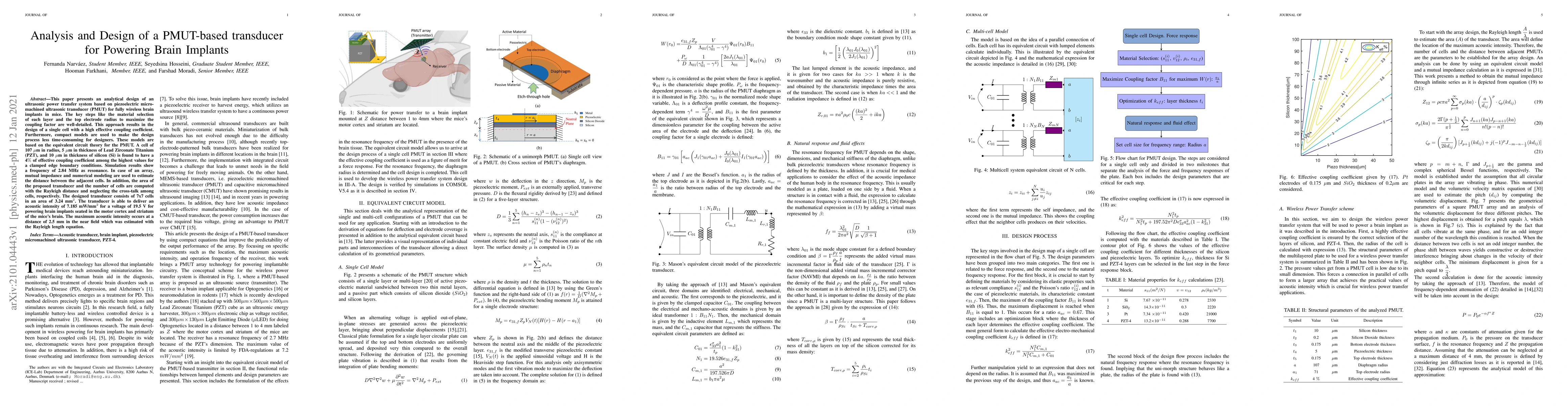 This paper presents an analytical design of an ultrasonic power transfer system based on piezoelectric micro-machined ultrasonic transducer (PMUT) for fully wireless brain implants in mice. The key steps like the material selection of each layer and the top electrode radius to maximize the coupling factor are well-detailed. This approach results in the design of a single cell with a high effective coupling coefficient. Furthermore, compact models are used to make the design process less time-consuming for designers. These models are based on the equivalent circuit theory for the PMUT. A cell of 107 um in radius, 5 um in thickness of Lead Zirconate Titanium (PZT), and 10 um in thickness of silicon (Si) is found to have a 4% of effective coupling coefficient among the highest values for a clamped edge boundary conditions. Simulation results show a frequency of 2.84 MHz as resonance. In case of an array, mutual impedance and numerical modeling are used to estimate the distance between the adjacent cells. In addition, the area of the proposed transducer and the number of cells are computed with the Rayleigh distance and neglecting the cross-talk among cells, respectively. The designed transducer consists of 7x7 cells in an area of 3.24 mm2. The transducer is able to deliver an acoustic intensity of 7.185 mW/mm2 for a voltage of 19.5 V for powering brain implants seated in the motor cortex and striatum of the mice's brain. The maximum acoustic intensity occurs at a distance of 2.5 mm in the near field which was estimated with the Rayleigh length equation.