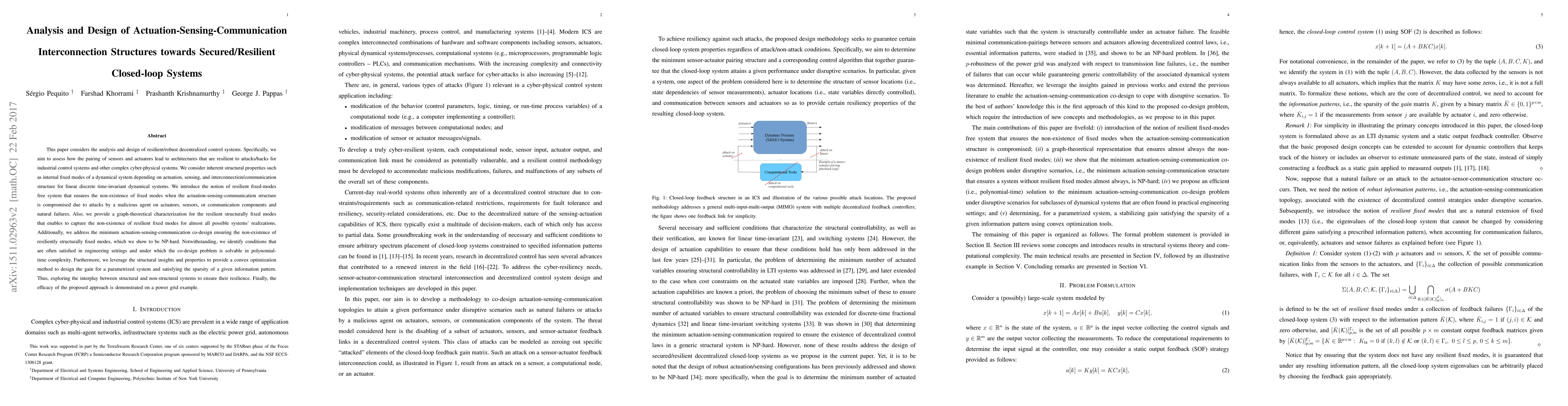 The paper analyzes and designs resilient decentralized control systems for industrial control systems and complex cyber-physical systems, focusing on the pairing of sensors and actuators to ensure resilience against attacks or failures.