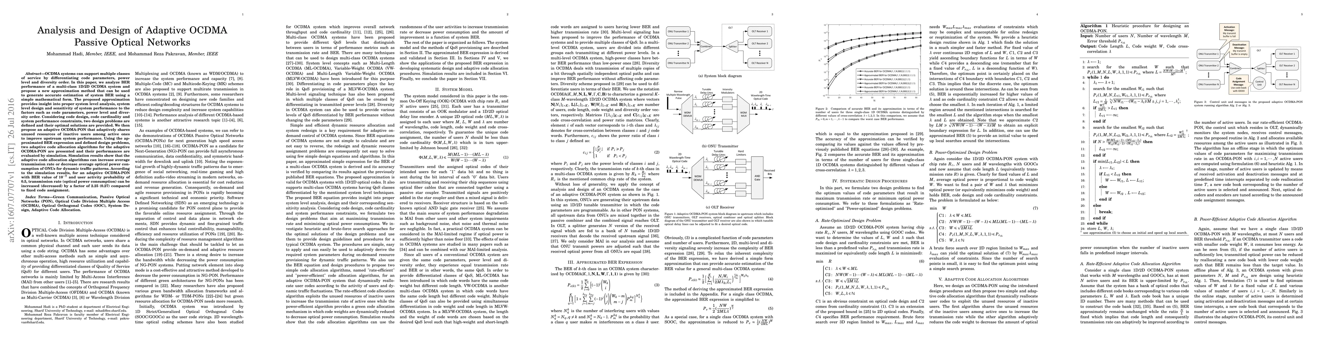 OCDMA systems can support multiple classes of service by differentiating code parameters, power level and diversity order. In this paper, we analyze BER performance of a multi-class 1D/2D OCDMA system and propose a new approximation method that can be used to generate accurate estimation of system BER using a simple mathematical form. The proposed approximation provides insight into proper system level analysis, system level design and sensitivity of system performance to the factors such as code parameters, power level and diversity order. Considering code design, code cardinality and system performance constraints, two design problems are defined and their optimal solutions are provided. We then propose an adaptive OCDMA-PON that adaptively shares unused resources of inactive users among active ones to improve upstream system performance. Using the approximated BER expression and defined design problems, two adaptive code allocation algorithms for the adaptive OCDMA-PON are presented and their performances are evaluated by simulation. Simulation results show that the adaptive code allocation algorithms can increase average transmission rate or decrease average optical power consumption of ONUs for dynamic traffic patterns. According to the simulation results, for an adaptive OCDMA-PON with BER value of 1e-7 and user activity probability of 0.5, transmission rate (optical power consumption) can be increased (decreased) by a factor of 2.25 (0.27) compared to fixed code assignment.