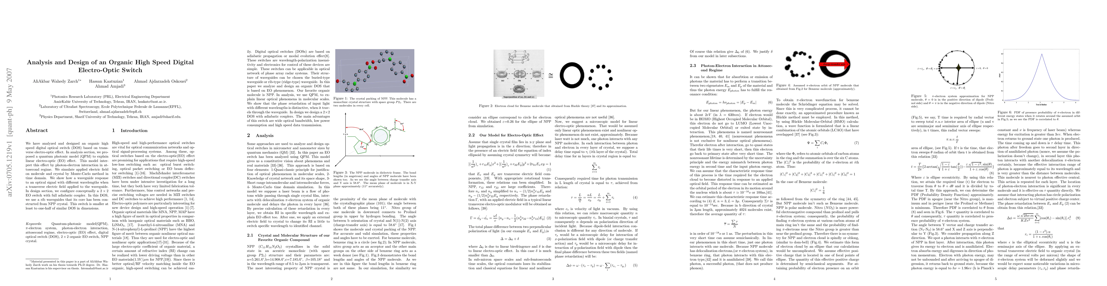 We have analyzed and designed an organic high speed digital optical switch (DOS) based on transverse electro-optic effect. In analysis section, we proposed a quantum photonic model (QPM) to explain linear electro-optic (EO) effect. This model interpret this effect by photon-electron interaction in attosecond regime. We simulate applied electric field on molecule and crystal by Monte-Carlo method in time domain. We show how a waveguide response to an optical signal with different wavelengths when a transverse electric field applied to the waveguide. In design section, we configure conceptually a 2 * 2 EO switch with full adiabatic coupler. In this DOS, we use a rib waveguides that its core has been constructed from NPP crystal. This switch is smaller at least to one-half of similar DOS in dimensions.