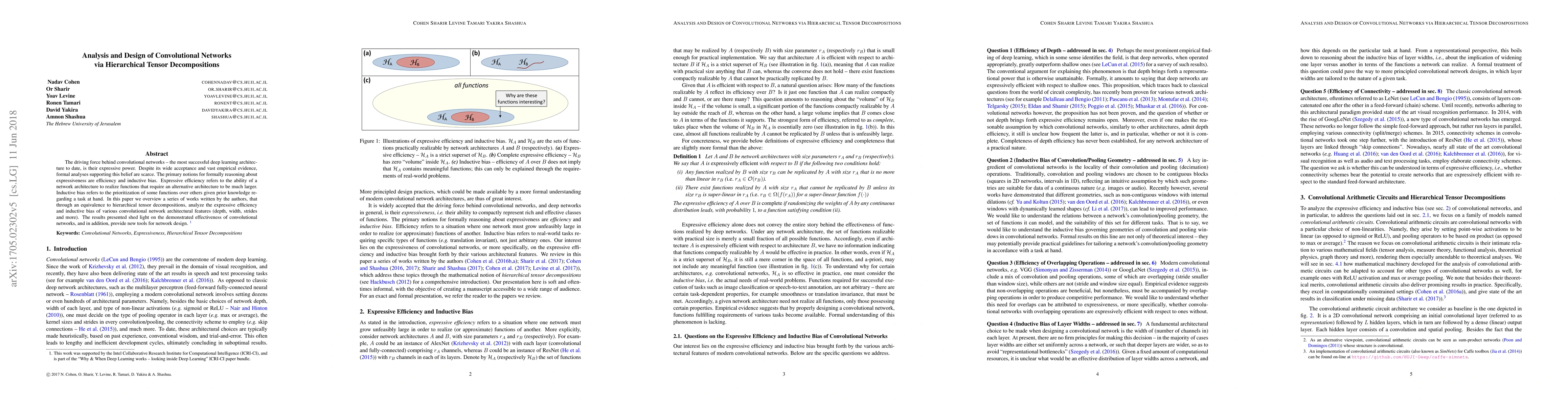 This paper analyzes convolutional networks' expressive efficiency and inductive bias through hierarchical tensor decompositions, revealing insights into their effectiveness and offering new tools for designing more efficient network architectures. The study emphasizes the depth, width, and other features of convolutional networks.
