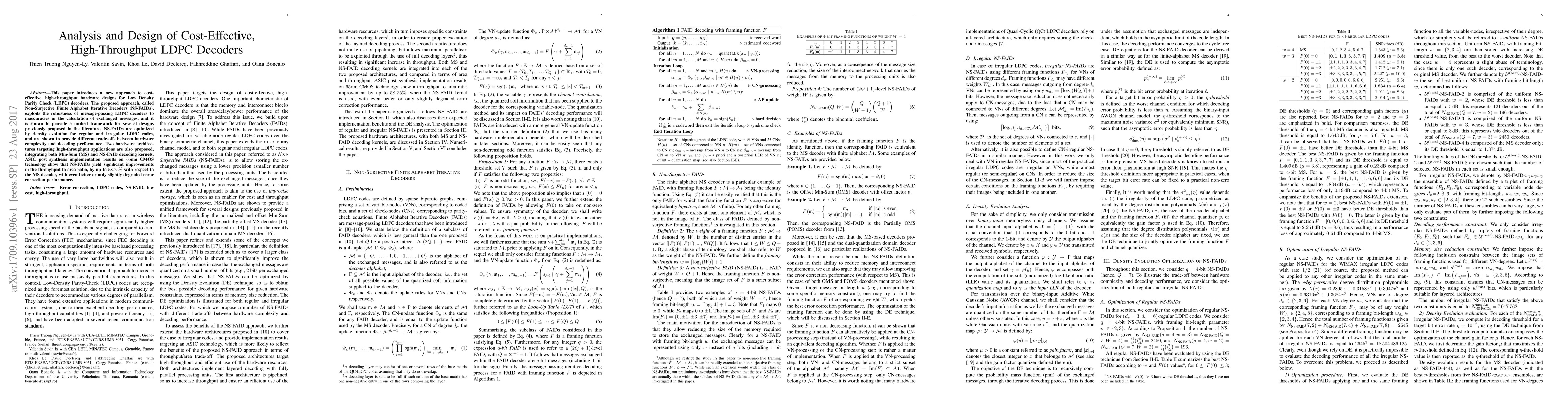 This paper proposes Non-Surjective Finite Alphabet Iterative Decoders (NS-FAIDs) for cost-effective, high-throughput LDPC decoders, showing improved throughput-to-area ratios and comparable error correction performance compared to Min-Sum decoders. The NS-FAIDs framework integrates both MS and NS-FAID decoding kernels in two proposed hardware architectures.