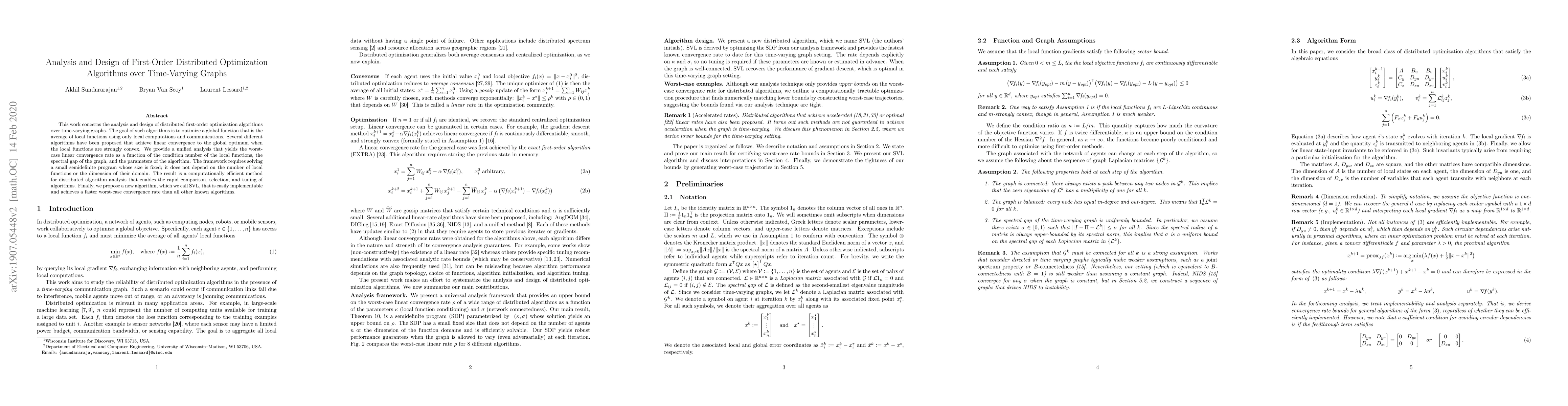 This paper analyzes and designs distributed first-order optimization algorithms over time-varying graphs, providing a unified framework for assessing their convergence rates and introducing a new algorithm, SVL, that outperforms existing methods. The proposed framework is computationally efficient and enables rapid algorithm comparison and tuning.