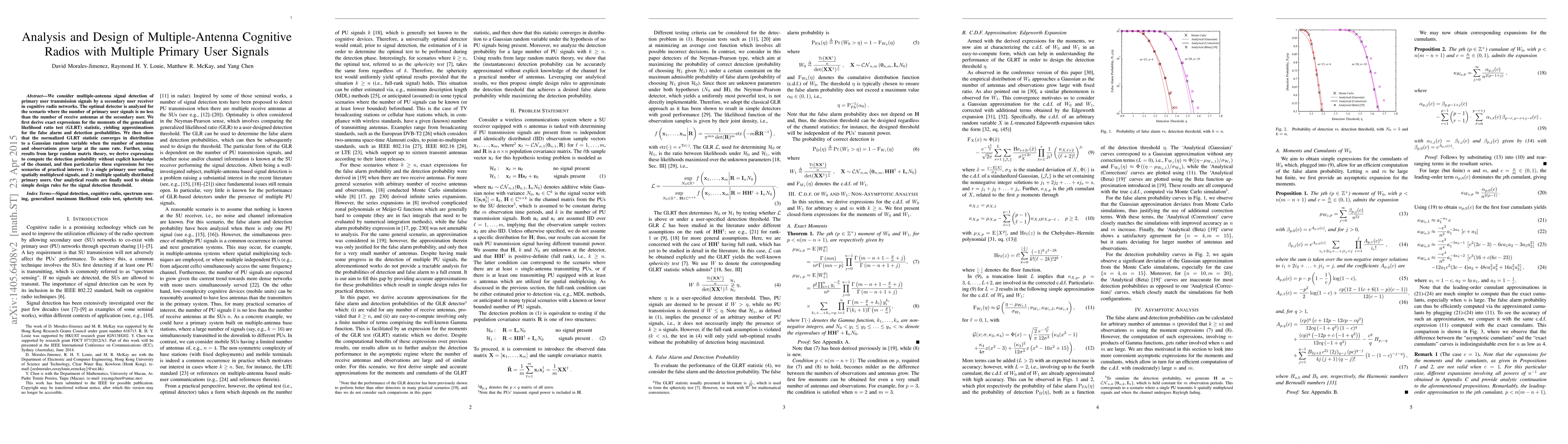This paper analyzes optimal signal detection for multiple-antenna cognitive radios detecting multiple primary user signals. It derives expressions for the moments of the GLRT statistic and shows its convergence to a Gaussian distribution under large antenna and observation conditions, providing practical detection probability expressions for single and multiple spatially distributed primary users.