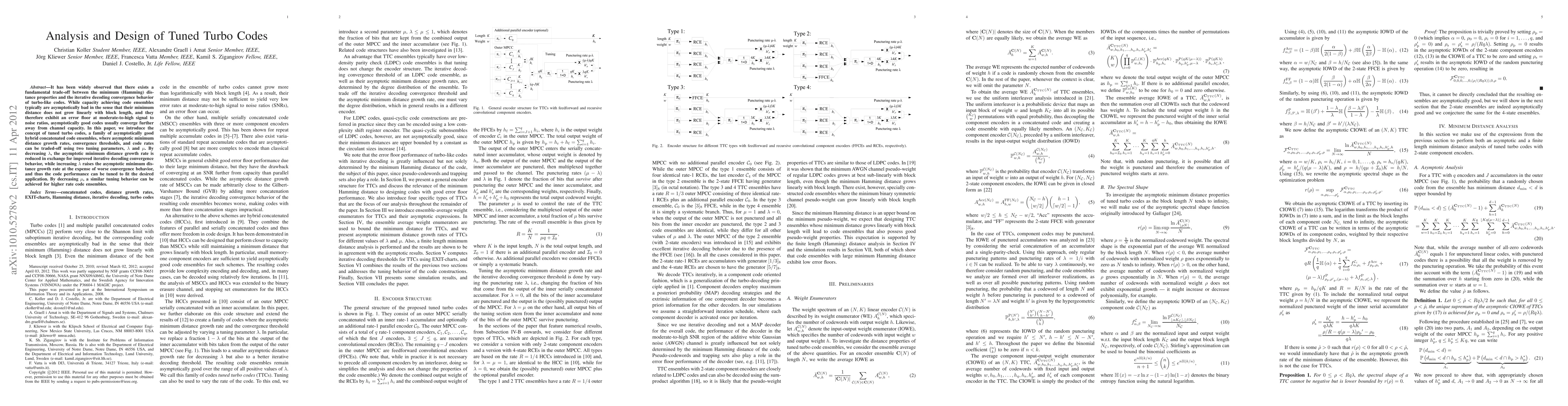 It has been widely observed that there exists a fundamental trade-off between the minimum (Hamming) distance properties and the iterative decoding convergence behavior of turbo-like codes. While capacity achieving code ensembles typically are asymptotically bad in the sense that their minimum distance does not grow linearly with block length, and they therefore exhibit an error floor at moderate-to-high signal to noise ratios, asymptotically good codes usually converge further away from channel capacity. In this paper, we introduce the concept of tuned turbo codes, a family of asymptotically good hybrid concatenated code ensembles, where asymptotic minimum distance growth rates, convergence thresholds, and code rates can be traded-off using two tuning parameters, {\lambda} and {\mu}. By decreasing {\lambda}, the asymptotic minimum distance growth rate is reduced in exchange for improved iterative decoding convergence behavior, while increasing {\lambda} raises the asymptotic minimum distance growth rate at the expense of worse convergence behavior, and thus the code performance can be tuned to fit the desired application. By decreasing {\mu}, a similar tuning behavior can be achieved for higher rate code ensembles.