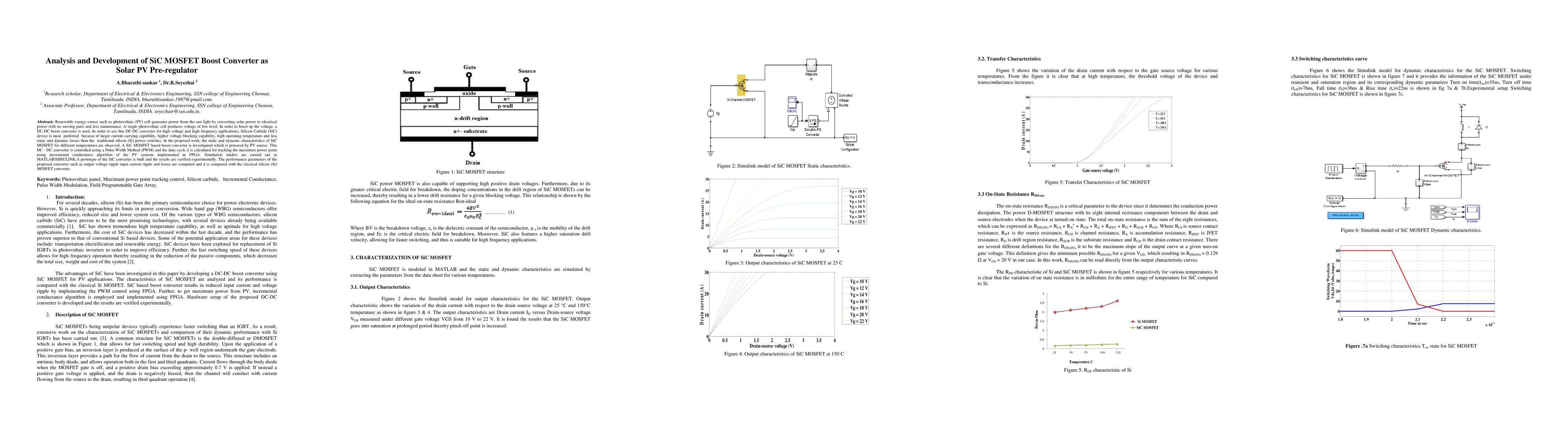 Renewable energy source such as photovoltaic (PV) cell generates power from the sun light by converting solar power to electrical power with no moving parts and less maintenance. A single photovoltaic cell produces voltage of low level. In order to boost up the voltage, a DC-DC boost converter is used. In order to use this DC-DC converter for high voltage and high frequency applications, Silicon Carbide (SiC) device is most preferred because of larger current carrying capability, higher voltage blocking capability, high operating temperature and less static and dynamic losses than the traditional silicon (Si) power switches. In the proposed work, the static and dynamic characteristics of SiC MOSFET for different temperatures are observed. A SiC MOSFET based boost converter is investigated which is powered by PV source. This DC - DC converter is controlled using a Pulse-Width Method (PWM) and the duty cycle d is calculated for tracking the maximum power point using incremental conductance algorithm of the PV systems implemented in FPGA. Simulation studies are carried out in MATLAB/SIMULINK.A prototype of the SiC converter is built and the results are verified experimentally. The performance parameters of the proposed converter such as output voltage ripple input current ripple and losses are computed and it is compared with the classical silicon (Si) MOSFET converter.