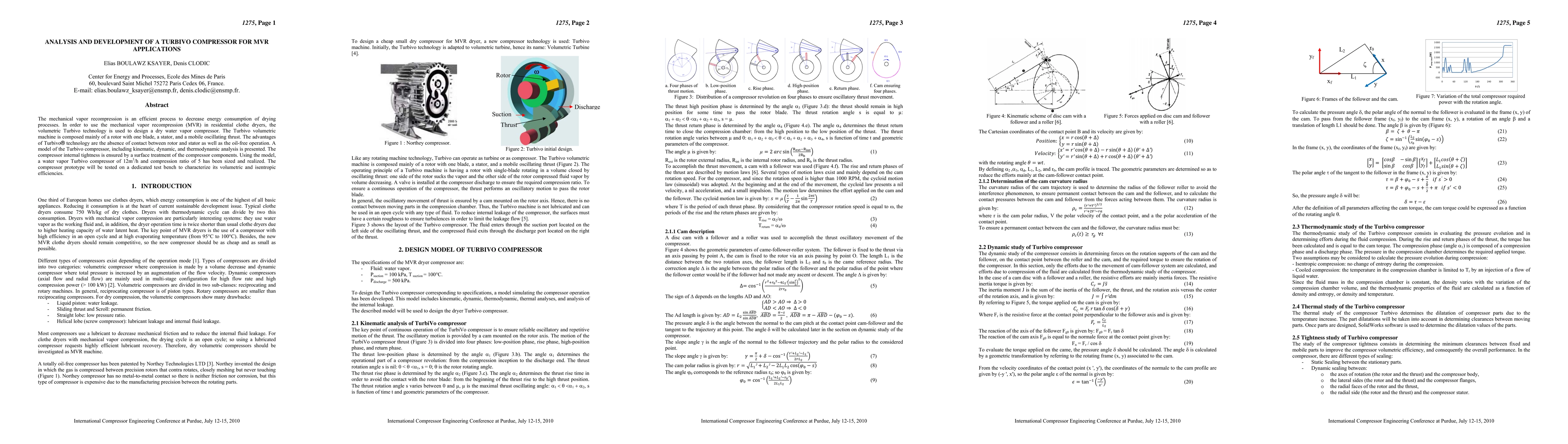 The mechanical vapor recompression is an efficient process to decrease energy consumption of drying processes. In order to use the mechanical vapor recompression (MVR) in residential clothe dryers, the volumetric Turbivo technology is used to design a dry water vapor compressor. The Turbivo volumetric machine is composed mainly of a rotor with one blade, a stator, and a mobile oscillating thrust. The advantages of Turbivo(R) technology are the absence of contact between rotor and stator as well as the oil-free operation. A model of the Turbivo compressor, including kinematic, dynamic, and thermodynamic analysis is presented. The compressor internal tightness is ensured by a surface treatment of the compressor components. Using the model, a water vapor Turbivo compressor of 12m3/h and compression ratio of 5 has been sized and realized. The compressor prototype will be tested on a dedicated test bench to characterize its volumetric and isentropic efficiencies.
