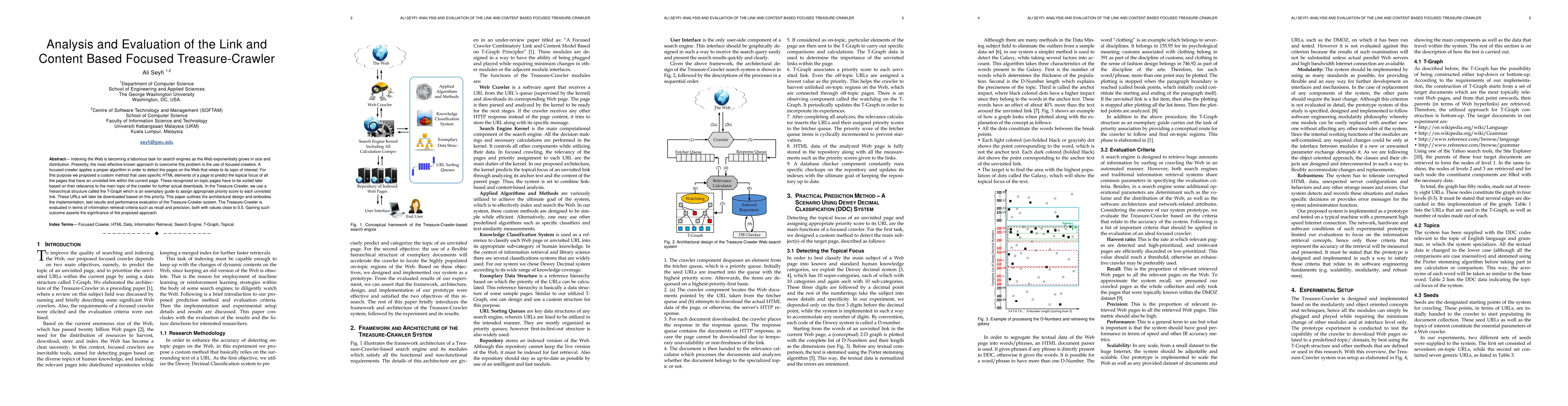 This paper proposes a focused crawler called Treasure-Crawler that uses a T-Graph to prioritize unvisited links based on their relevance to the main topic. The system's performance is evaluated using recall and precision metrics, achieving values close to 0.5, demonstrating the effectiveness of the proposed method.