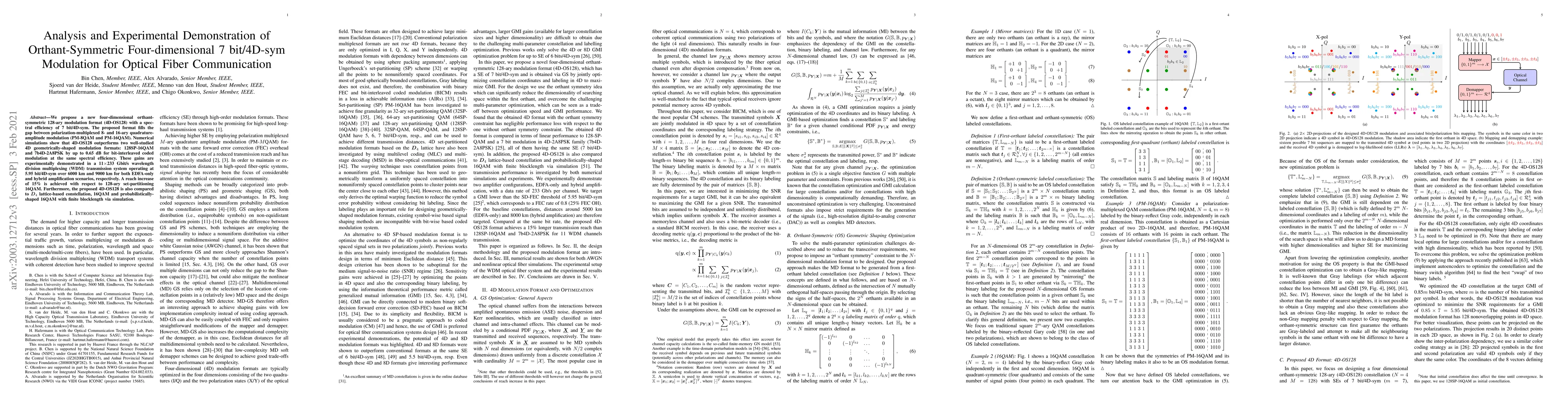 This paper proposes a new four-dimensional orthant-symmetric 128-ary modulation format (4D-OS128) for optical fiber communication, achieving a spectral efficiency of 7 bit/4D-sym. Experimental results show that 4D-OS128 outperforms existing 4D modulation formats by up to 0.65dB, leading to a 15% reach increase in long-distance WDM transmission.