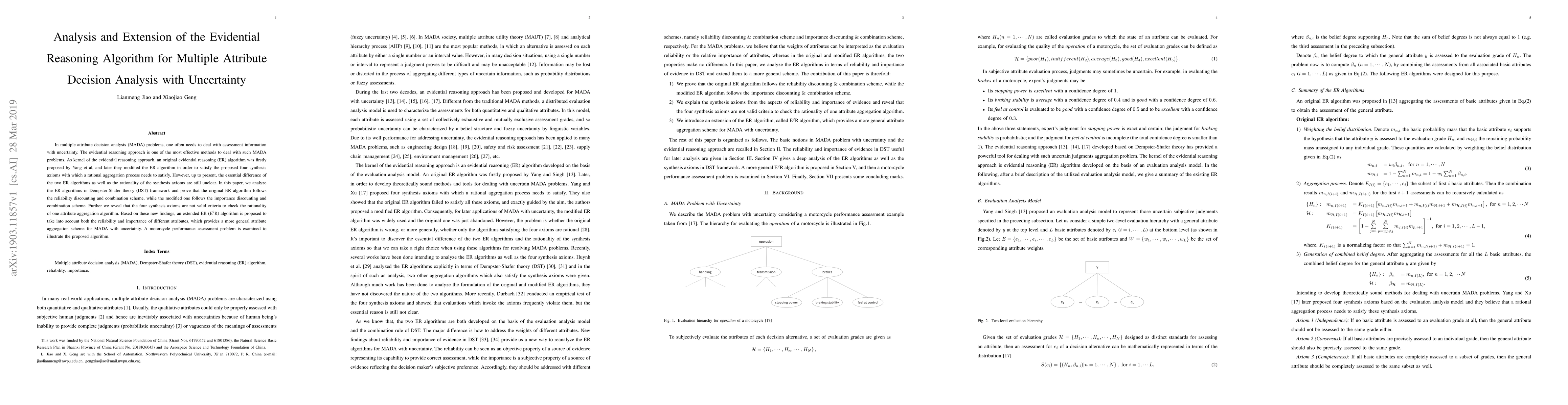 This paper analyzes and extends the evidential reasoning algorithm for multiple attribute decision analysis under uncertainty, revealing that the original and modified algorithms follow different combination schemes. An extended algorithm is proposed to incorporate both reliability and importance, providing a more general aggregation method for MADA.