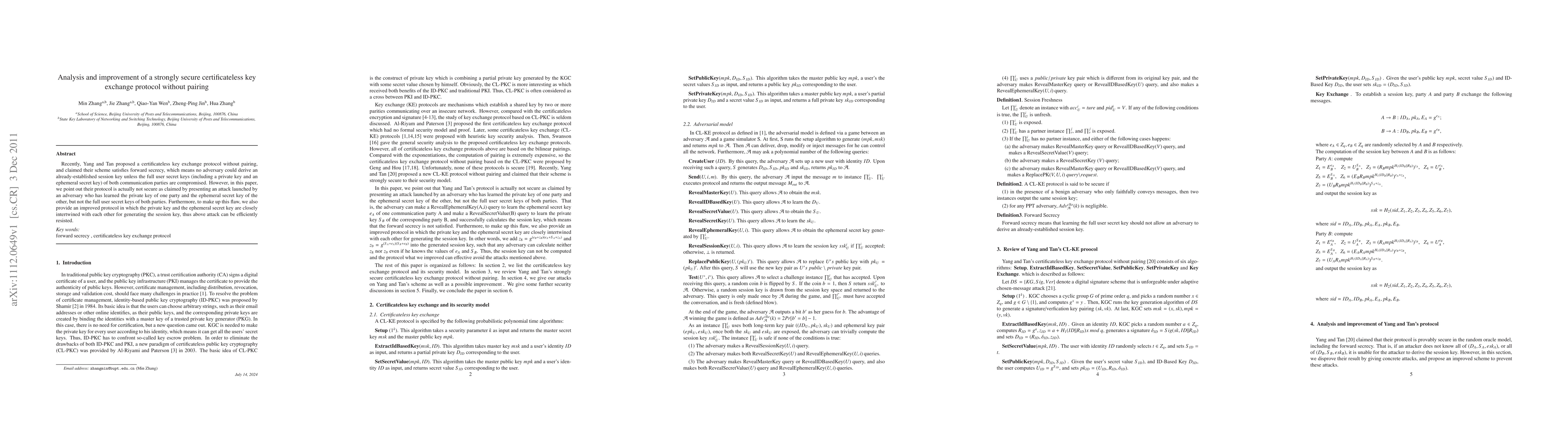 Recently, Yang and Tan proposed a certificateless key exchange protocol without pairing, and claimed their scheme satisfies forward secrecy, which means no adversary could derive an already-established session key unless the full user secret keys (including a private key and an ephemeral secret key) of both communication parties are compromised. However, in this paper, we point out their protocol is actually not secure as claimed by presenting an attack launched by an adversary who has learned the private key of one party and the ephemeral secret key of the other, but not the full user secret keys of both parties. Furthermore, to make up this flaw, we also provide an improved protocol in which the private key and the ephemeral secret key are closely intertwined with each other for generating the session key, thus above attack can be efficiently resisted.