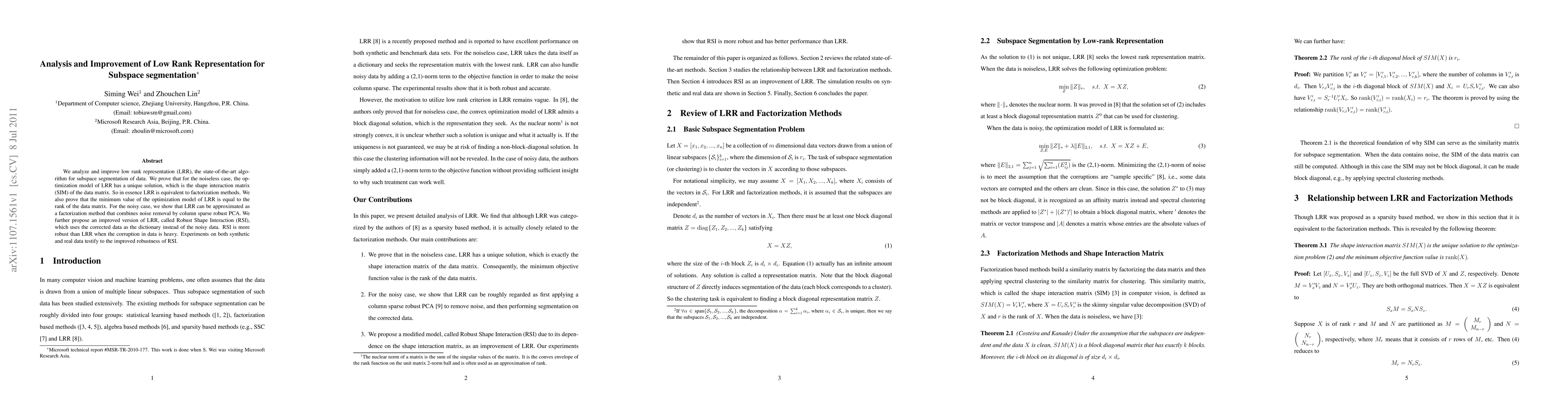 A research paper improves upon a state-of-the-art subspace segmentation algorithm, showing it is equivalent to factorization methods and offers enhanced robustness in noisy data scenarios.