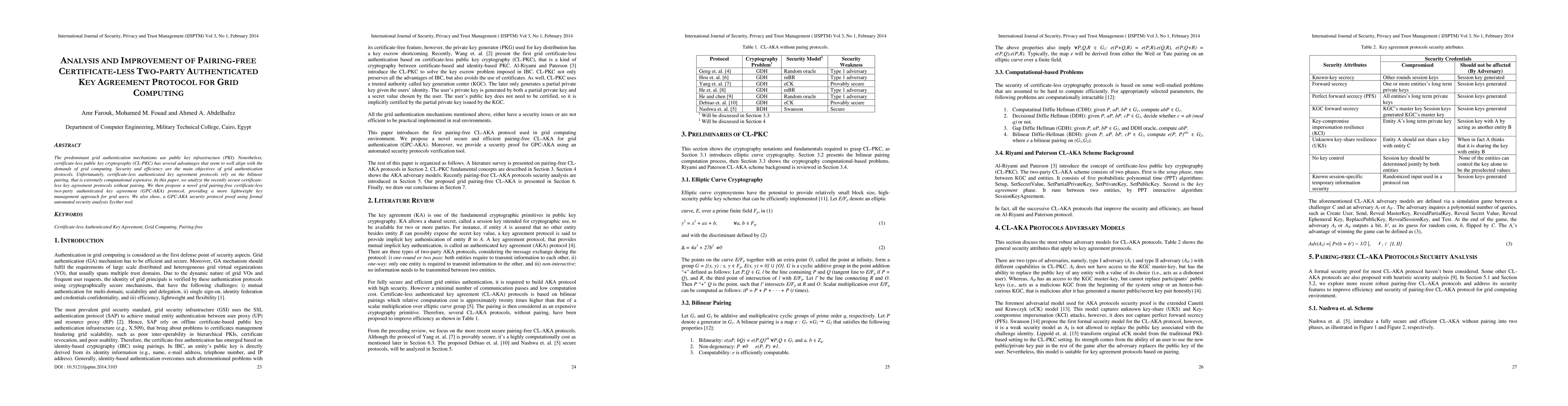 This paper analyzes existing certificate-less key agreement protocols without bilinear pairings for grid computing, highlighting their computational inefficiencies. It proposes a novel lightweight pairing-free certificate-less two-party authenticated key agreement protocol (GPC-AKA) and demonstrates its security using the Sycther tool.