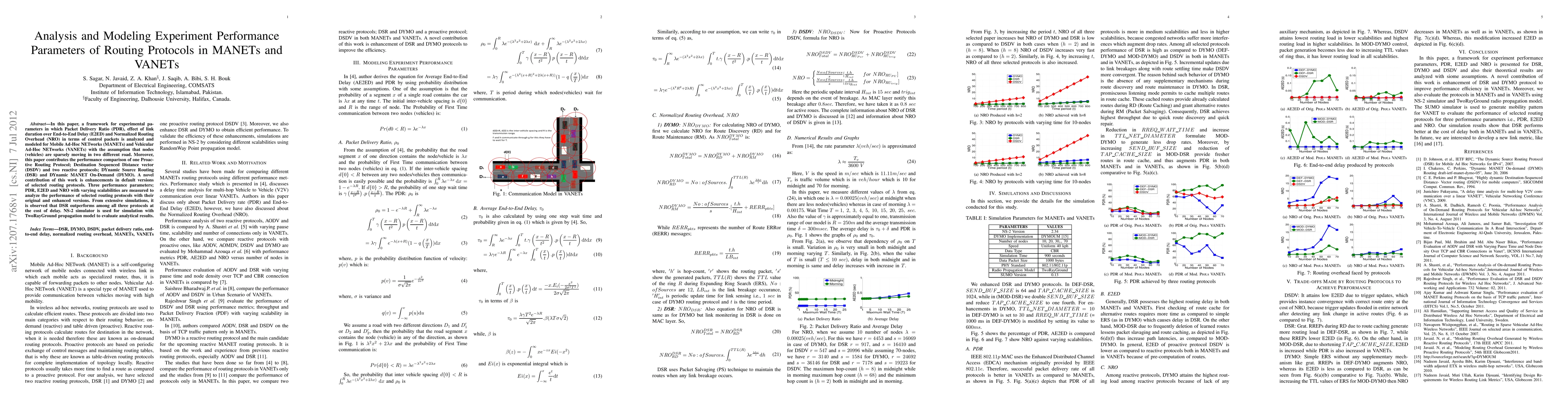 This paper analyzes and models performance parameters of routing protocols in MANETs and VANETs, focusing on Packet Delivery Ratio, End-to-End Delay, and Normalized Routing Overhead. It compares the performance of DSDV, DSR, and DYMO protocols, finding DSR to outperform others despite higher delays.